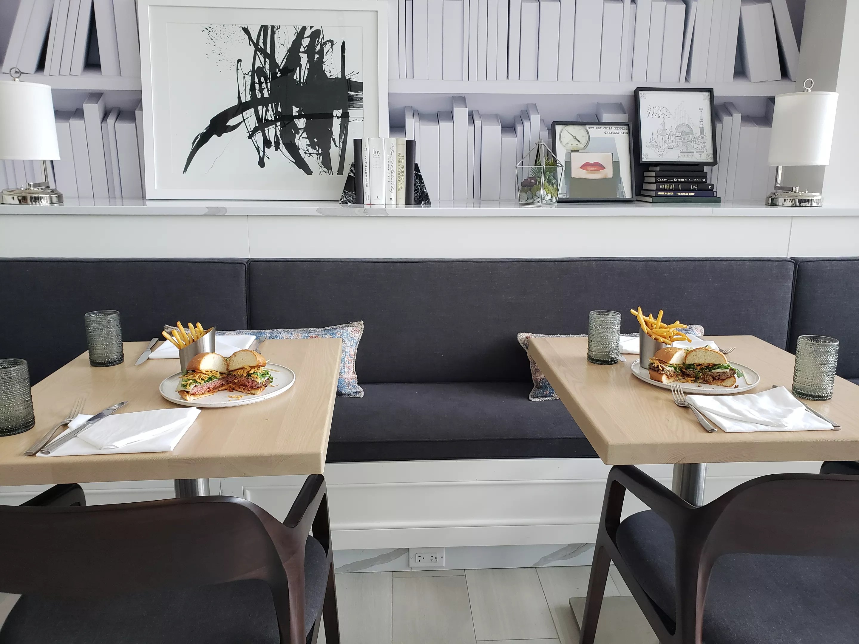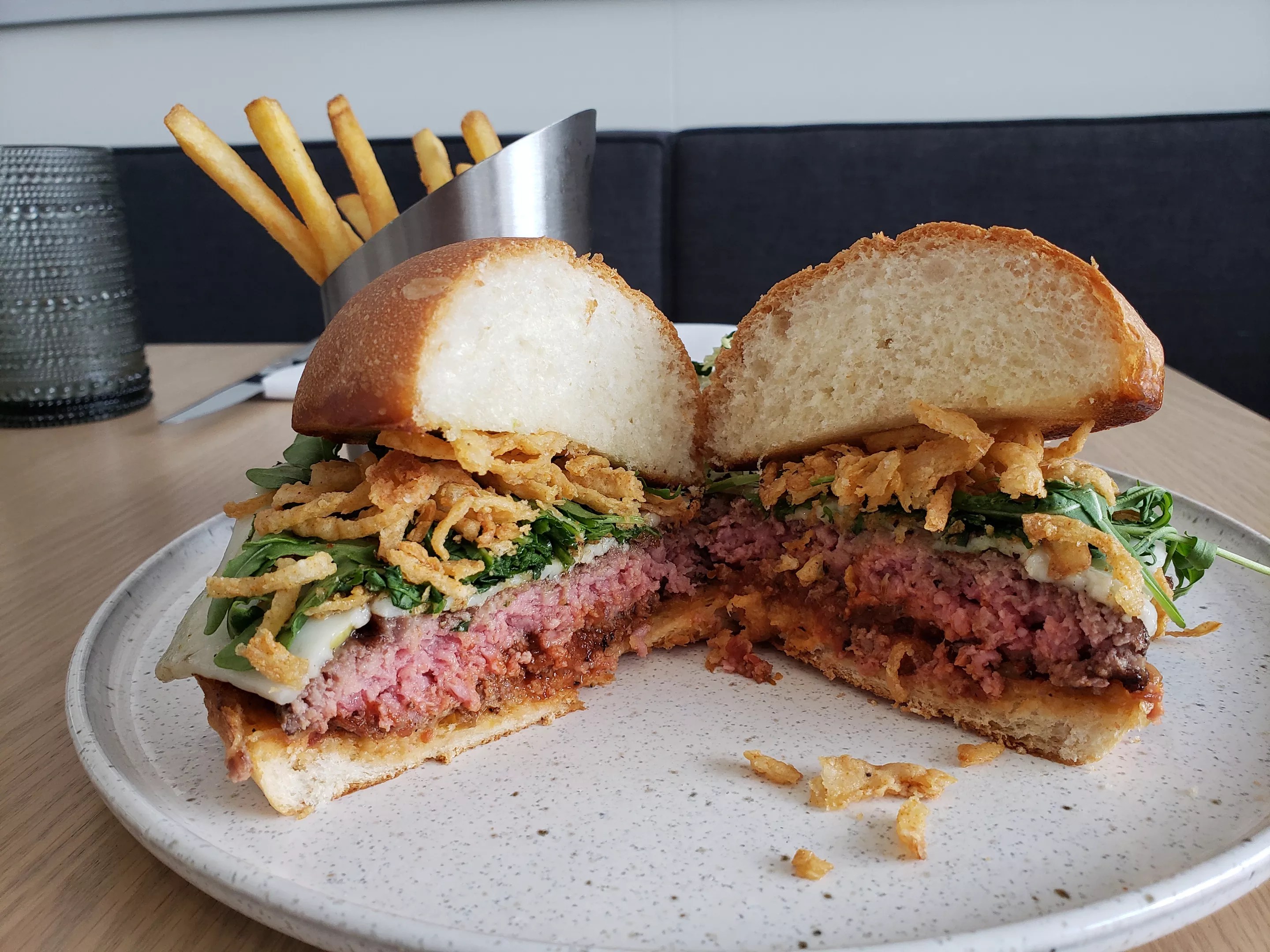 When the burgers arrived at our table, the pair look almost identical, though the Impossible patty was a little thinner. When we cut them open, one burger was definitely cooked medium-rare and the other well-done. Our server let us know the real beef was the pinker of the two.