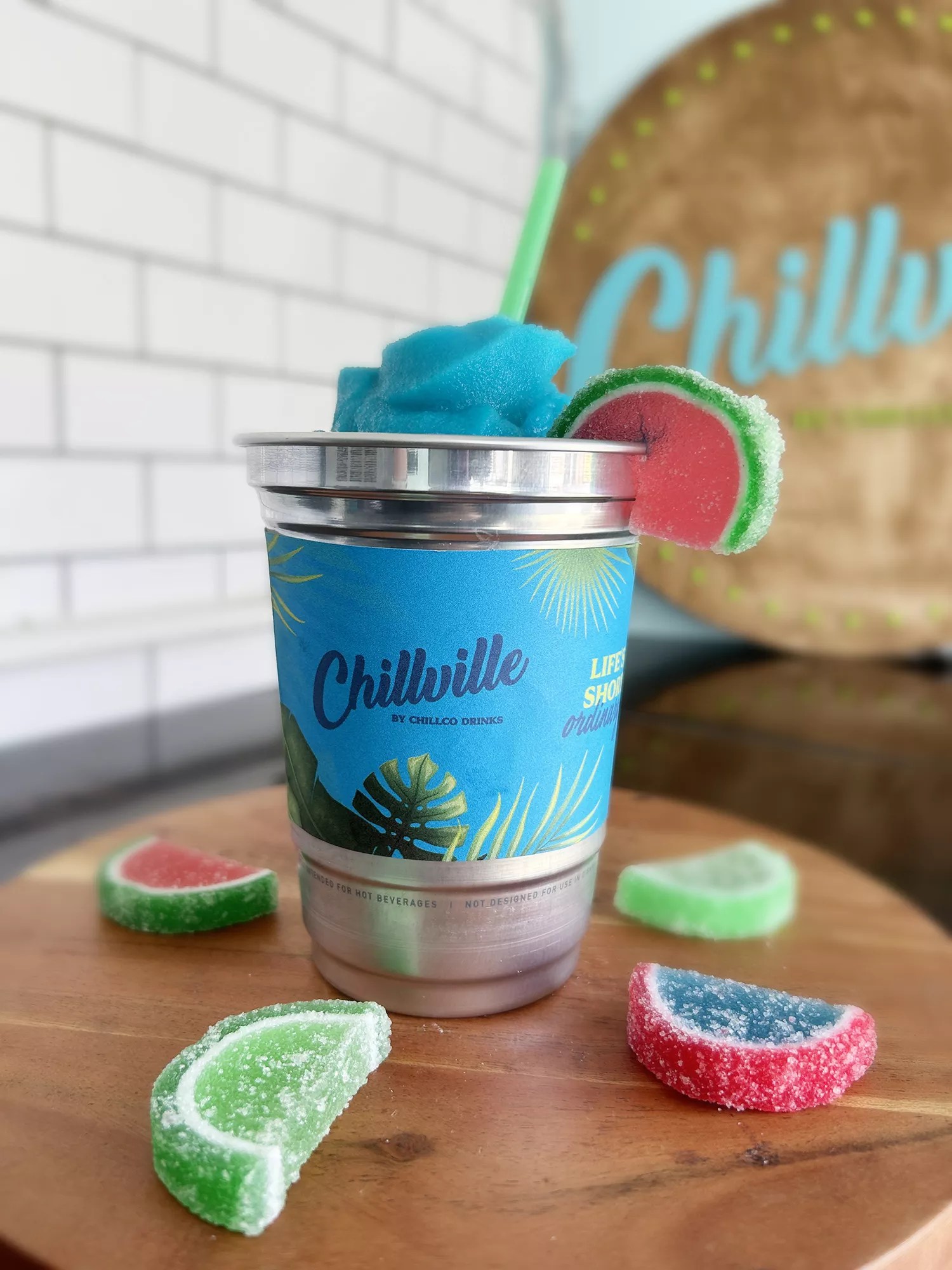 To keep its signature colorful look despite having to serve its drinks in opaque aluminum cups, Ashley designed custom coffee sleeves with a blue background covered in leaves. Chillco is also adding gummy candies to the Ball Arena drinks, which have gotten rave reviews.
