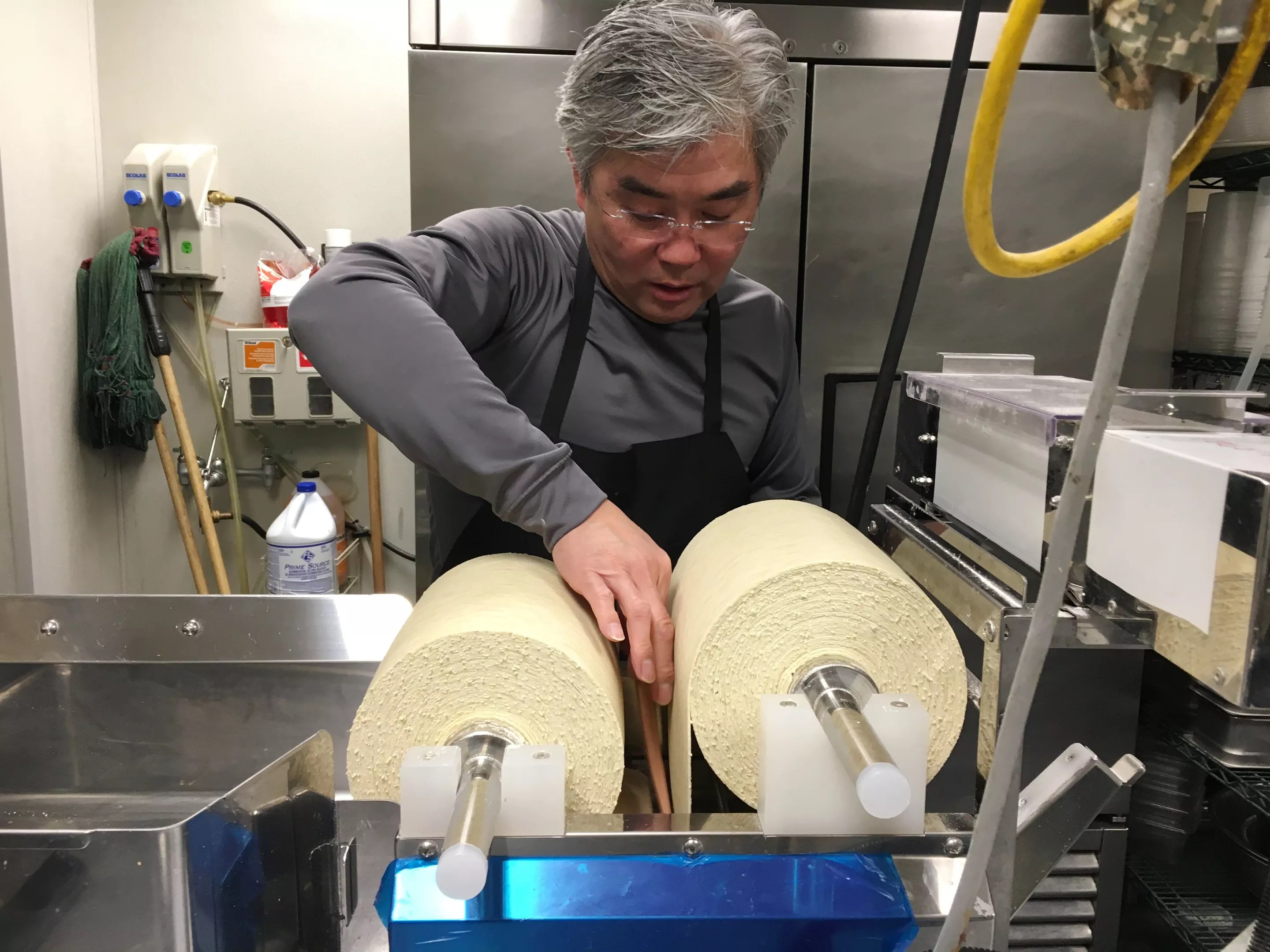 So instead of bringing in a purchased product, Zoe and his team decided to use an electric sheeter to roll out the homemade dough before feeding the sheets through another machine to cut them into the right width. But the process became more and more time-consuming as demand escalated.