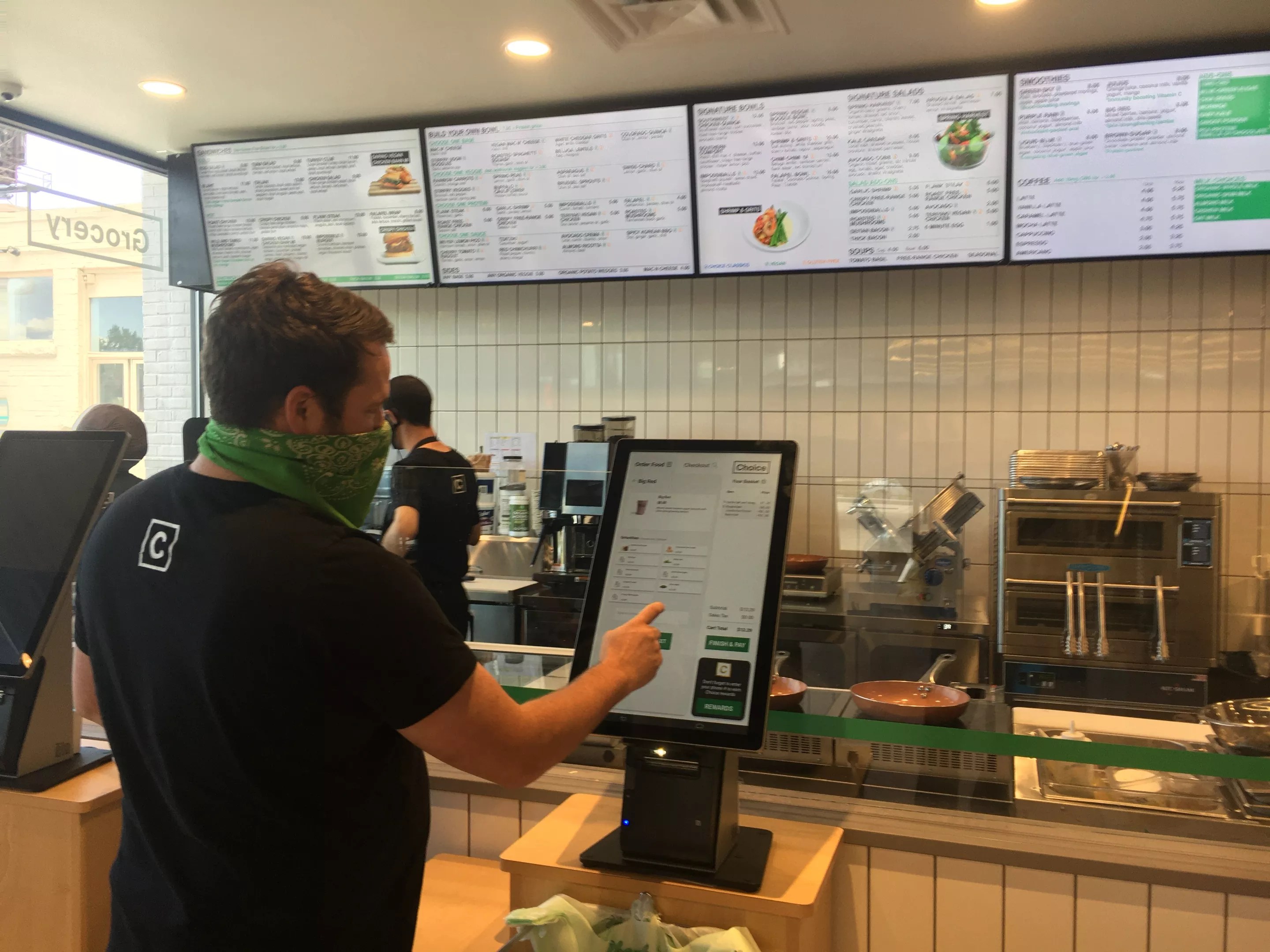 Choice Market founder Mike Fogarty demonstrates some of the store’s new technology.