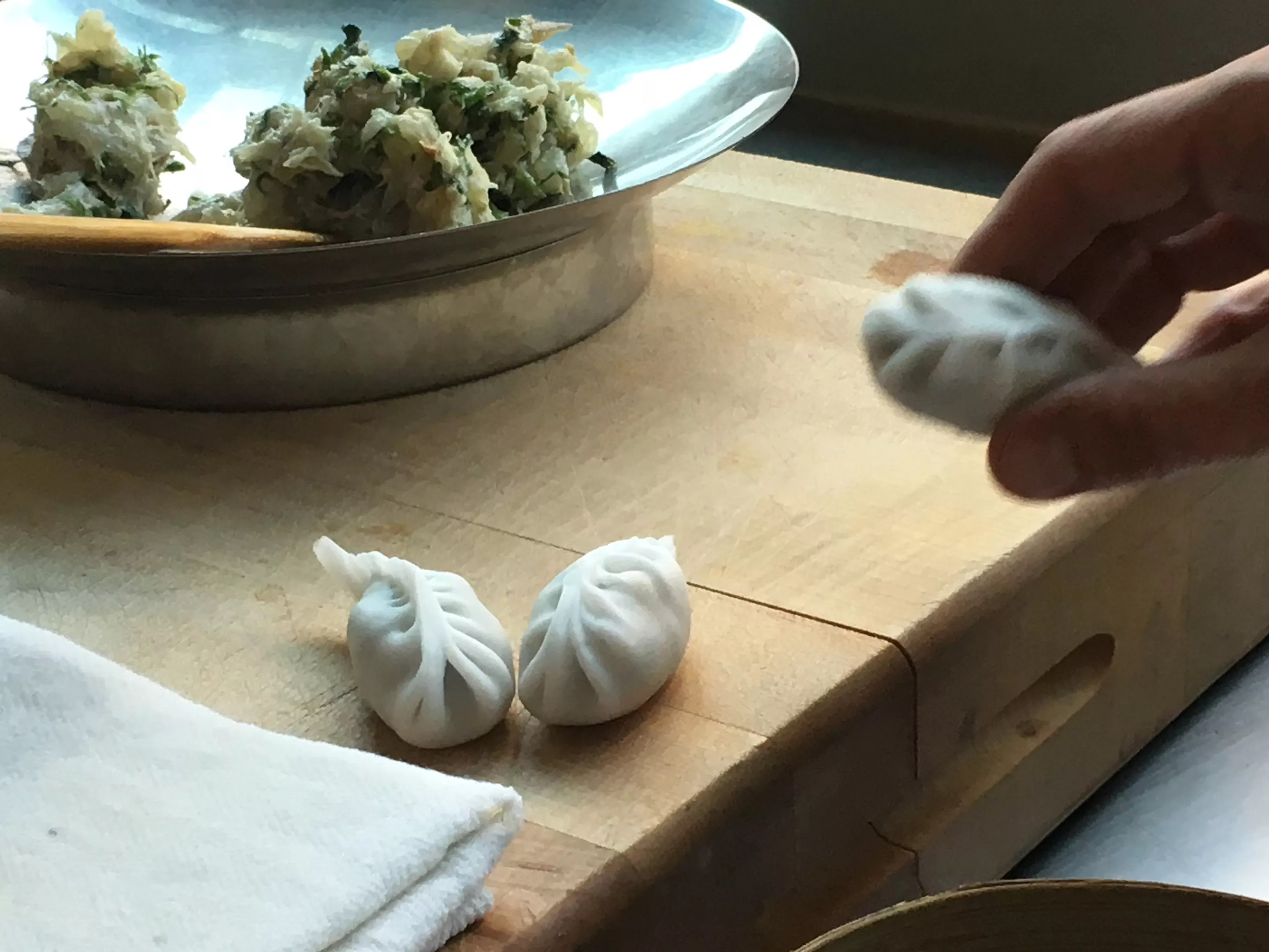 I watch Xiao carefully as she executes three more dumplings, because I know my turn is coming. She creates exactly eight pleats to form the ruffled edge of the dumpling, so that’s what I plan to replicate, but first I have to use her knife to press out my own wrappers. I botch the job, mashing down clumsily on the dough (Symensma’s behind me, instructing, “Don’t press so hard!”) until it’s a rippled oval rather than a neat circle. I try another and it comes out better – too thick, but at least the right size and shape. After scooping in a coarse-chopped shrimp mixture, I fold the dough like a taco and begin counting my pleats and pressing them into place with my trembling fingers. “Not bad!” I exclaim as I hold up the result to Xiao and Symensma, not realizing that I’m so tense I’ve jammed my thumb through the bottom of the dumpling.