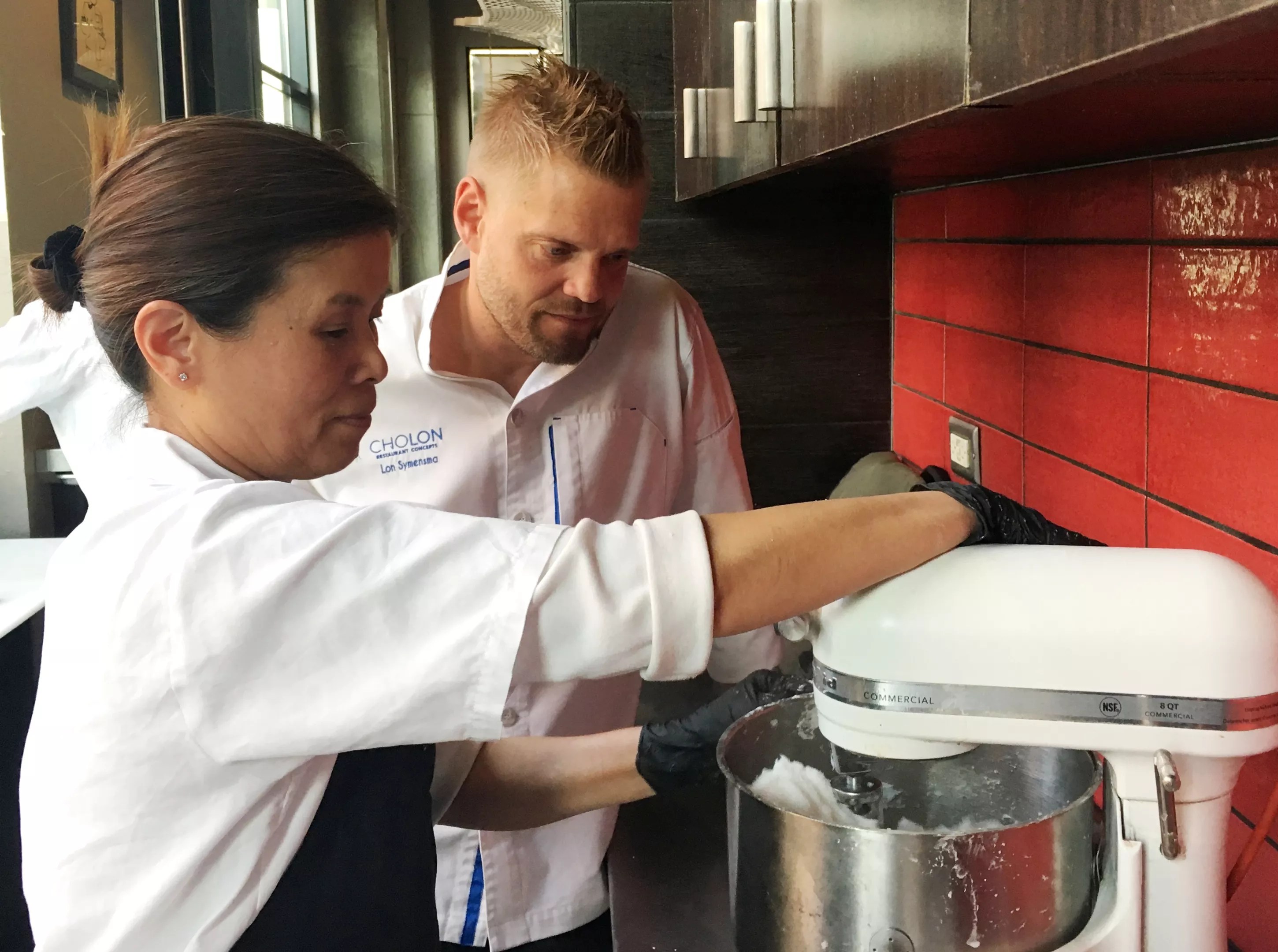 ChoLon chef/owner looks on as his new dim dum chef mixes har gow dough.