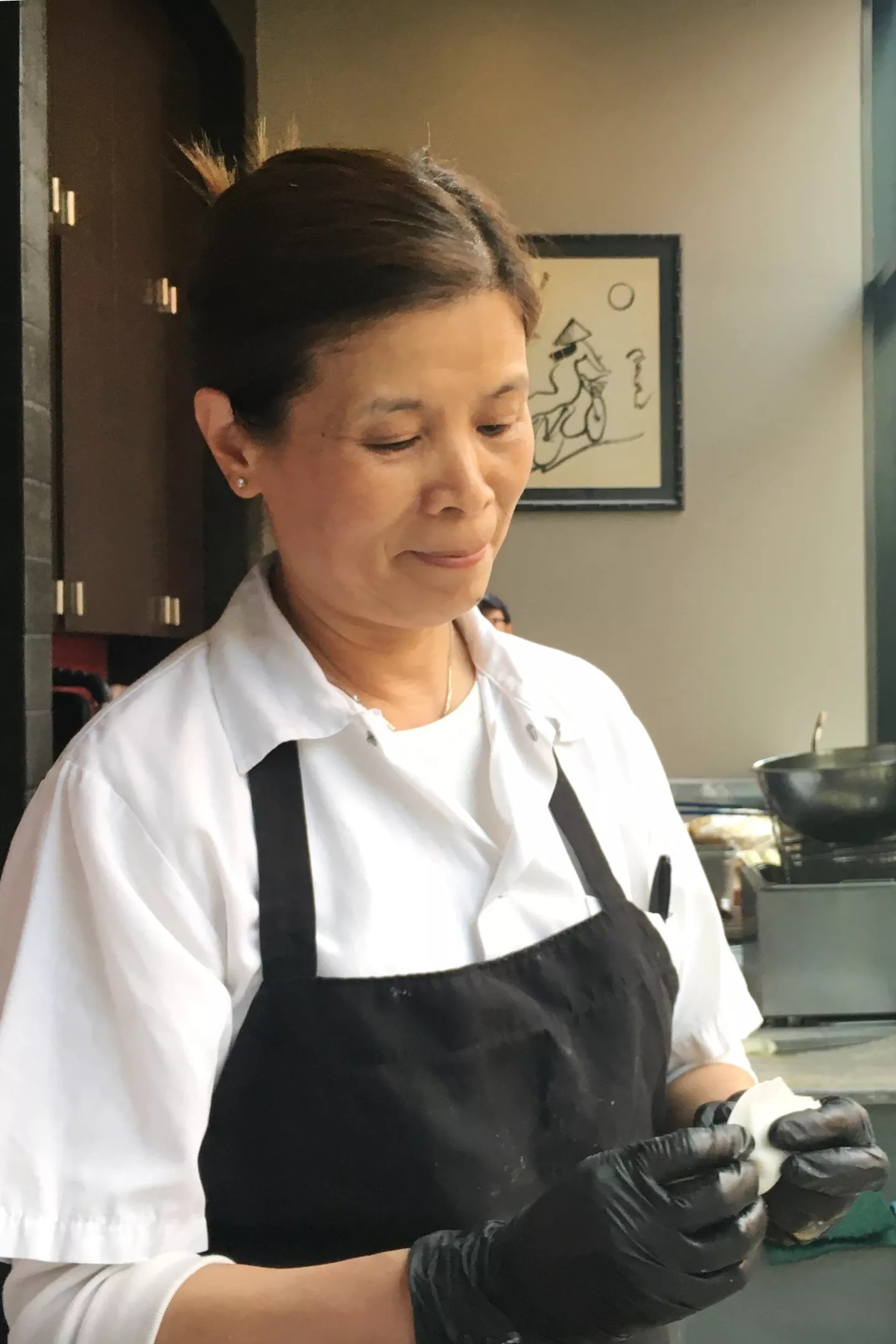 If you’ve eaten dim sum, you’ve seen shrimp-filled har gow dumplings gently steamed until the wrapper becomes translucent, showing off the pale pink shellfish beneath the surface. Getting the wrapper thin and even enough to turn transparent when cooked while staying firm enough to keep from tearing takes years of practice, but Xiao makes it look easy. Her nimble fingers, even in latex gloves, make quick work of the pleated pattern distinct to the har gow. They’re shaped like miniature bonnets, with pleats along one edge and a smooth arc of dough on the other. Xiao’s finished dumplings are so perfect, they could be used in a geometry classroom to demonstrate the symmetry of Euclidean curves.