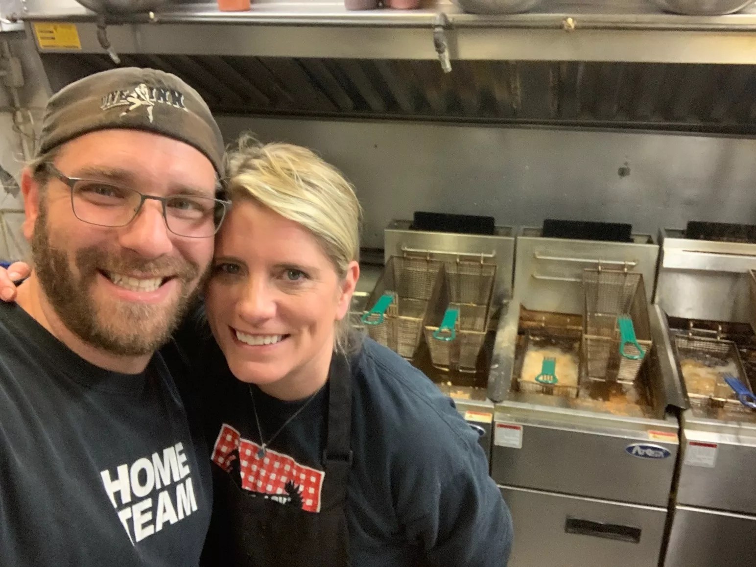 Rachael Hebel and her husband, Dave, in their old Cluck Truck kitchen at the Dive Inn.