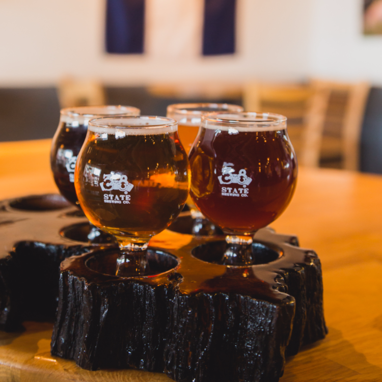 38 State Brewing also uses tree cross-sections for its tasting trays. In this case, however, they’ve been stained and finished to create gorgeous works of art.