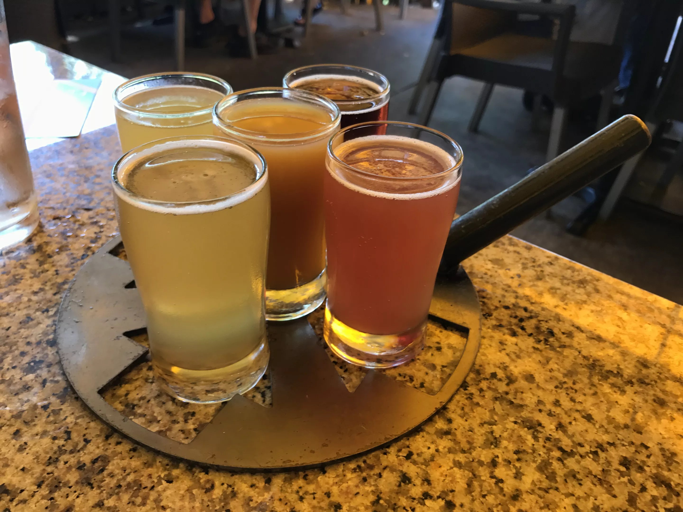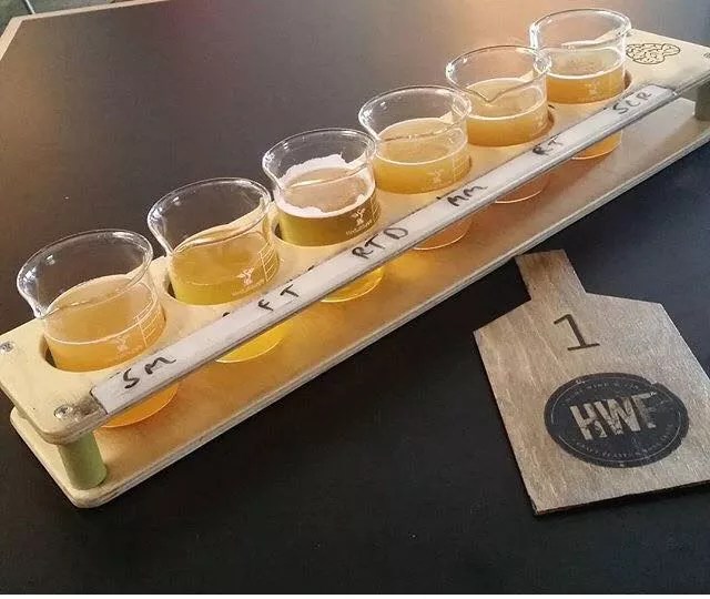 Fate Brewing also has custom taster trays that use the brewery’s logo – four arrows pointing inward – as holes for the glasses. The whole thing looks like a pizza peel.