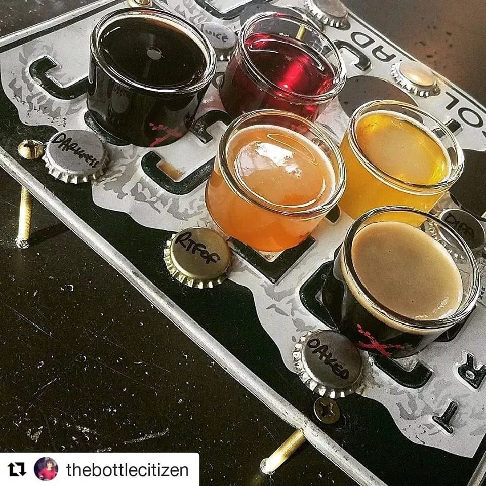 There’s nothing more emblematic of Colorado than the state’s green and white license plates, and Mockery Brewing goes native with its taster trays, which are made from the plates.