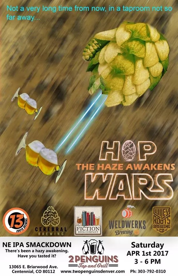 Two Penguins in Centennial will bring back its Hop Wars, this time featuring five hazy, New England-style IPAs that will go toe-to-toe for your love. The Haze Awakens takes place from 3 to 6 p.m on April 1 and features beer from Cerebral Brewing, Weldworks, Wiley Roots, Odd13 Brewing and Fiction Beer Company.