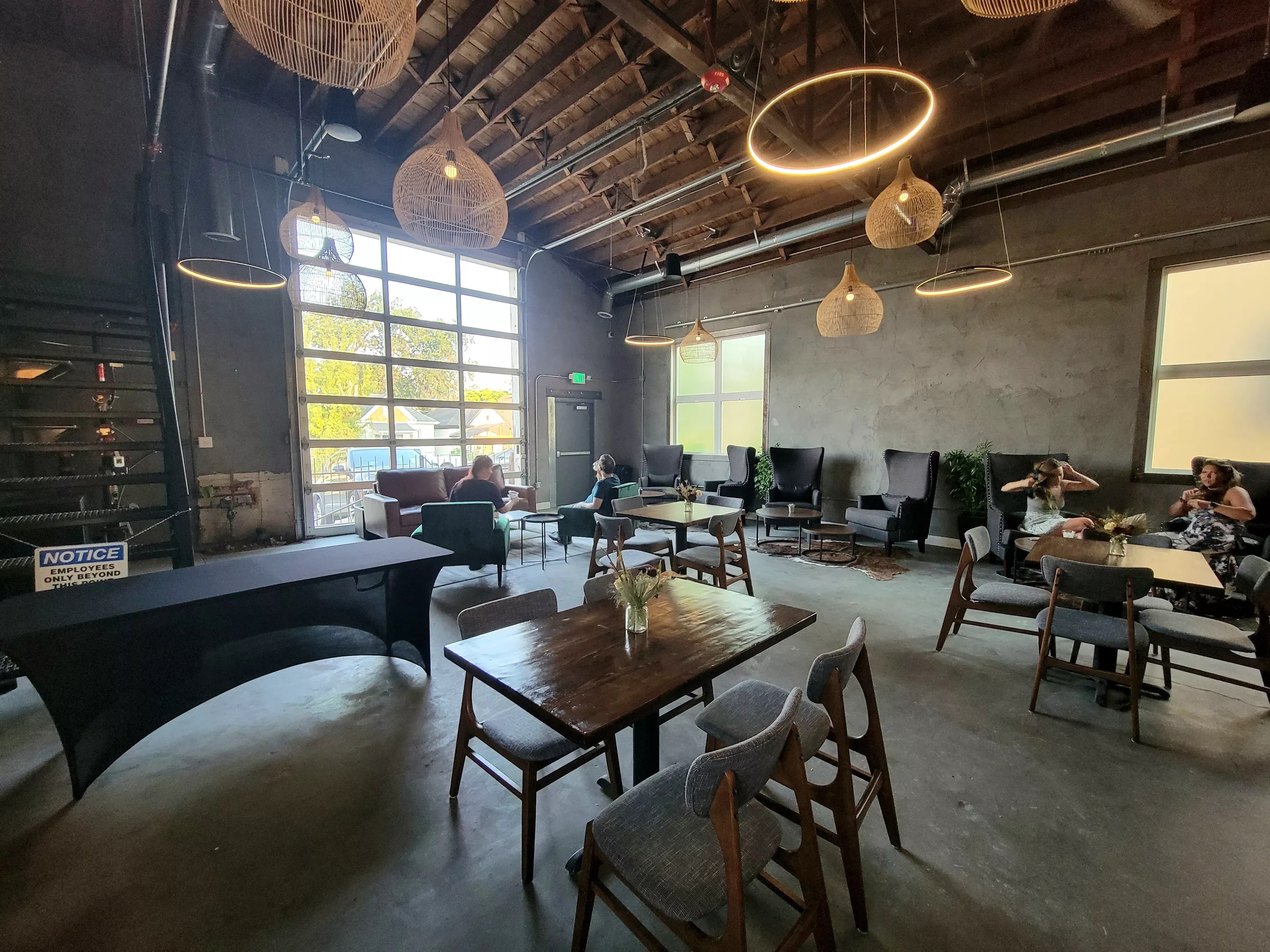 Wi-fi is included in the membership, and you can play Spotify on the speakers. There’s a private ten-person dining room you can reserve, and a 2,500-square-foot dog-friendly outdoor patio, complete with a few picnic tables.