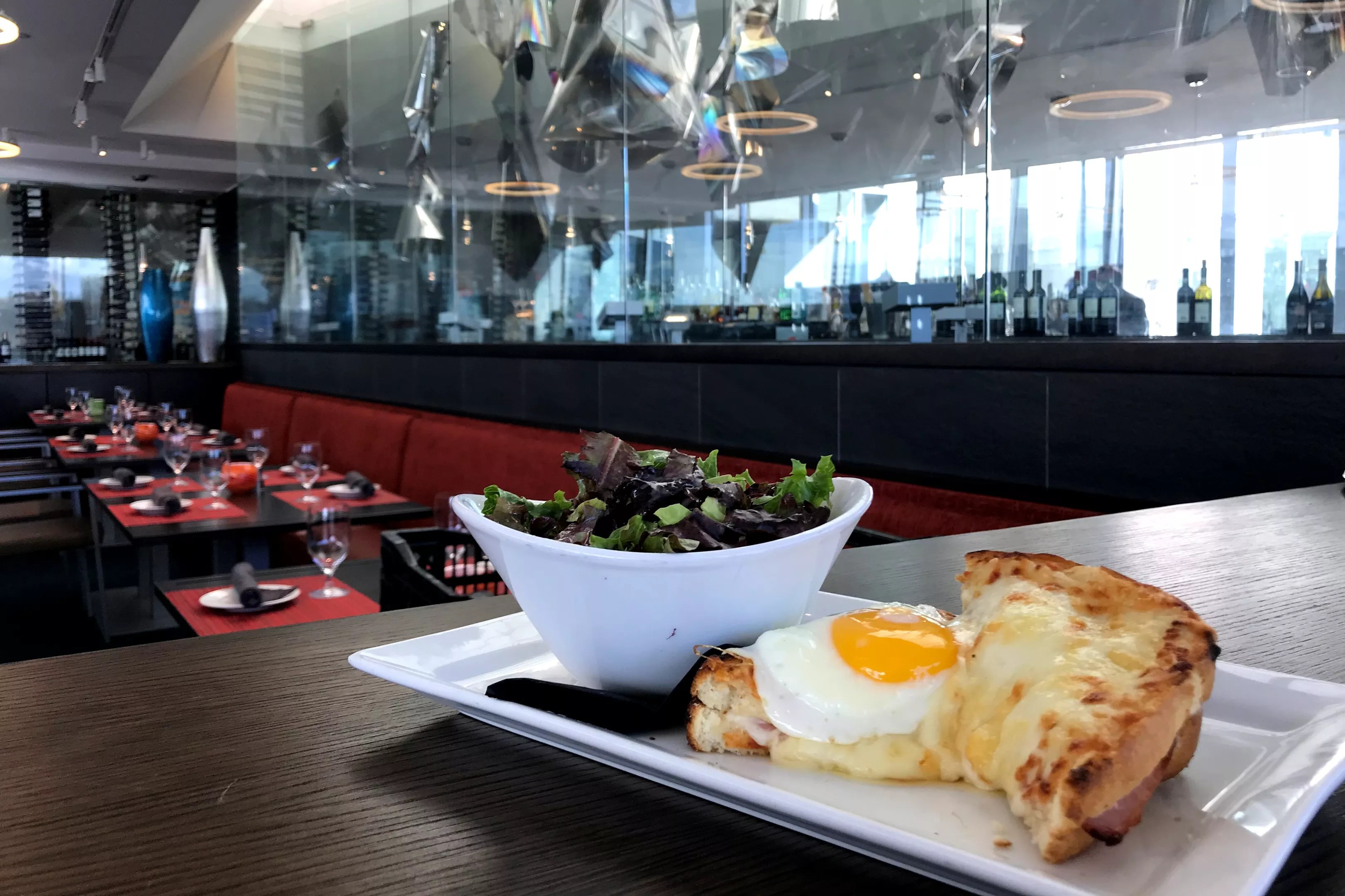 The croque madame, essentially an adult grilled cheese, is far richer than the quinoa bowl, with Gruyère cheese and ham sandwiched between slices of grilled sourdough bread and topped with creamy sauce, more cheese and a fried egg. It also came with a small side salad of mixed greens.