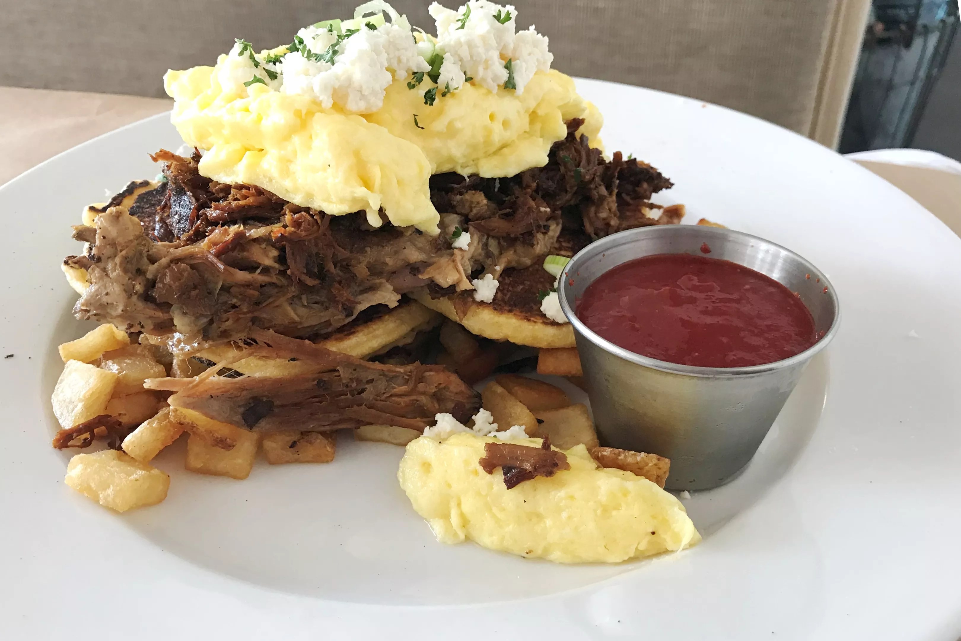 Interstate’s hoe cakes are topped with twelve-hour braised pork.