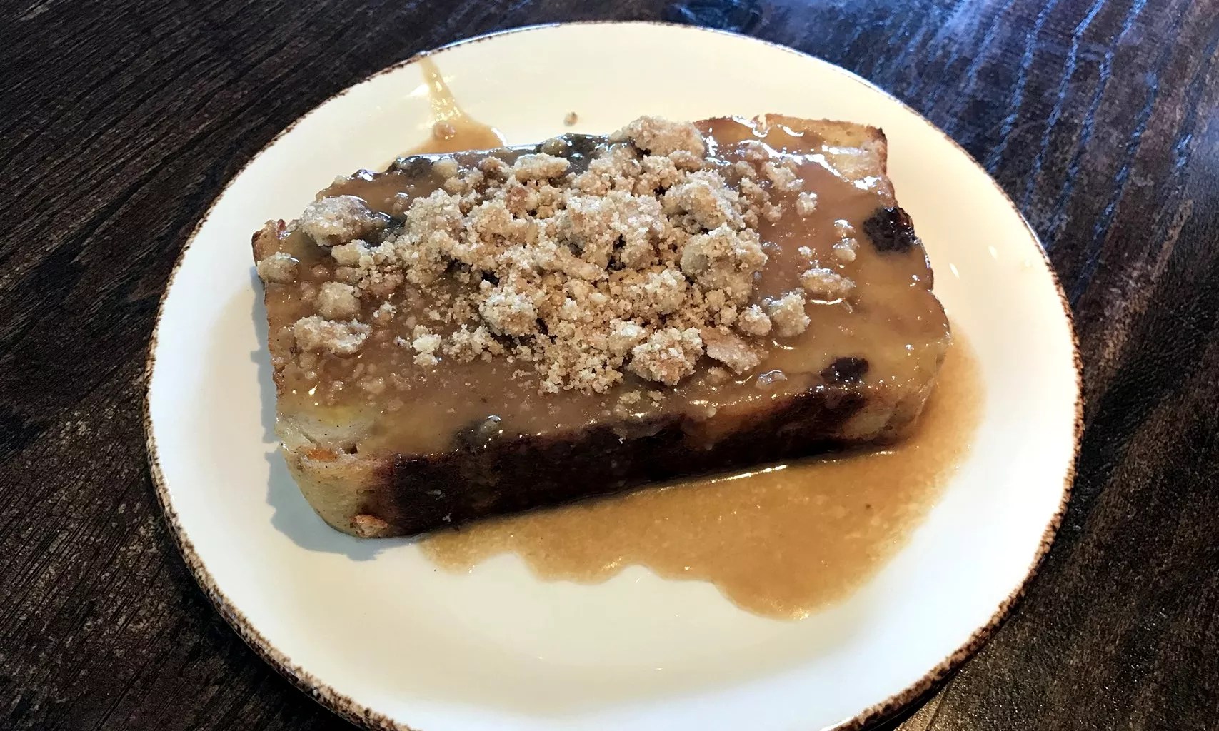 Roasted vegetables add flavor to the weekly quiche; mine had carrots and shallots, but next week’s could be different, depending on what’s available or in season. The quiche is baked in a flaky pie crust and comes with a small quinoa salad made with Rebel Farm greens. For a true Southern dish, don’t miss the eggs Sardou, similar to eggs Benedict, but with creamed spinach and artichokes instead of Canadian bacon. Foster serves his version on toast, covering the poached eggs in creamy Hollandaise. Another Southern favorite is the Kentucky hot brown, an open-faced sandwich stacked with smoked turkey and bacon and drowned in cheesy Mornay. It also comes with tomato jam, yet another savory-sweet element on the menu.