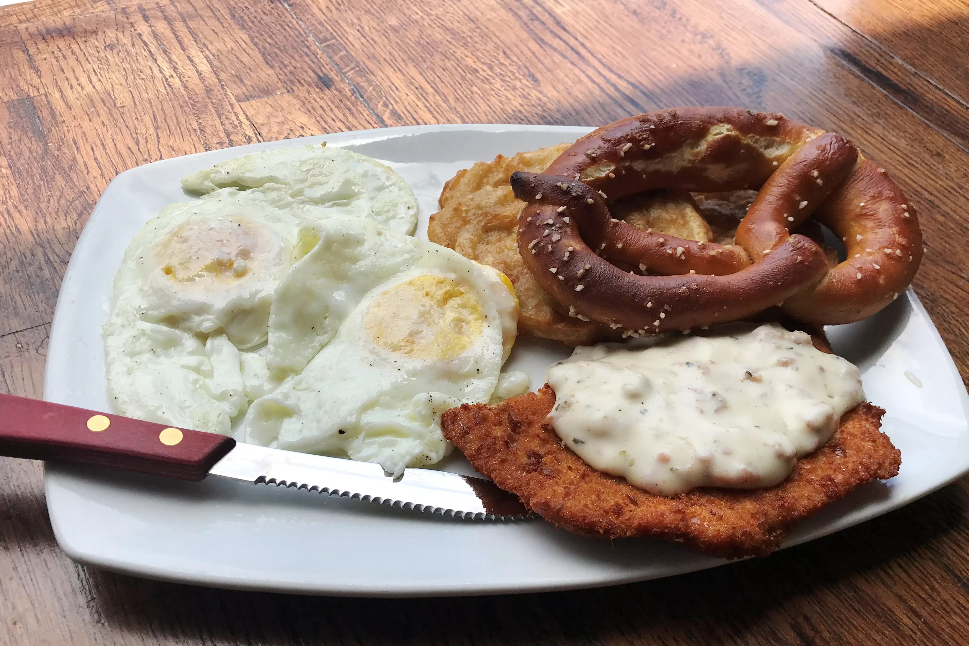 I’ve never considered schnitzel a breakfast food, but it’s a logical choice at Rhein Haus. The pork schnitzel breakfast comes with half of a pork cutlet smothered in seven-sausage gravy with a side of potato pancakes, eggs and a soft pretzel. Some of those seven sausages can also be ordered individually, and you can also put together a meal of side orders to create your own personalized breakfast. I opted for eggs, bacon, potato pancakes and cheesy kÁ¤sespÁ¤tzle. The potato pancakes were fried to a golden brown – crunchy on the outside and soft on the inside, nearly mimicking the texture of funnel cake. As good as the potatoes were, they were outdone by the kÁ¤sespÁ¤tzle, comparable to creamy mac and cheese, but with gnocchi-like spÁ¤tzle noodles standing in for macaroni. On the sweeter side, strawberry French toast goes nicely with that tequila-spiked radler.