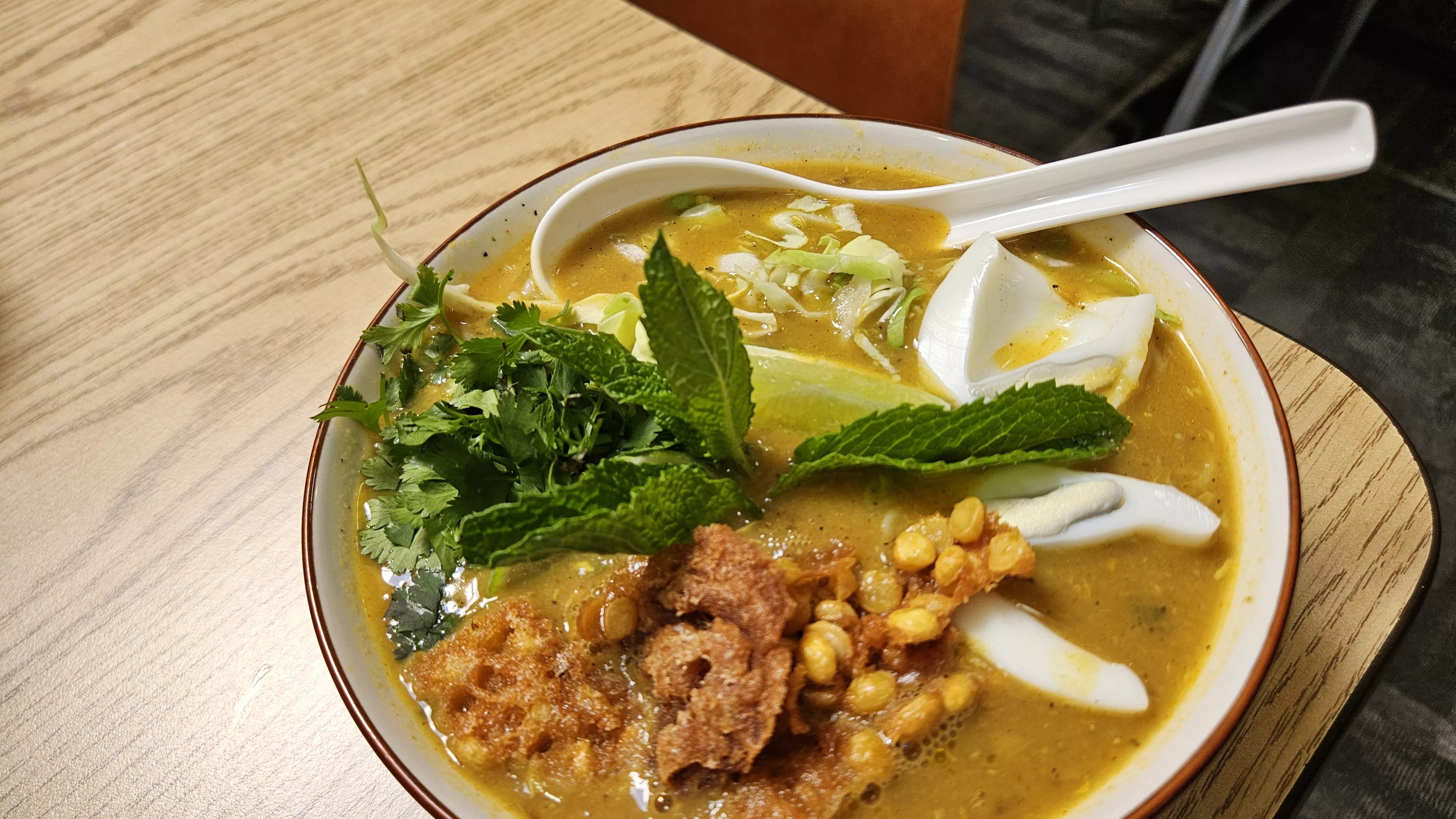 The server said that when I return, I should order his two favorite dishes: Ono Kaw Swe, a coconut milk soup with fried rice noodles, and Kat Gyi Kat, stir-fried noodles with the protein of your choice.