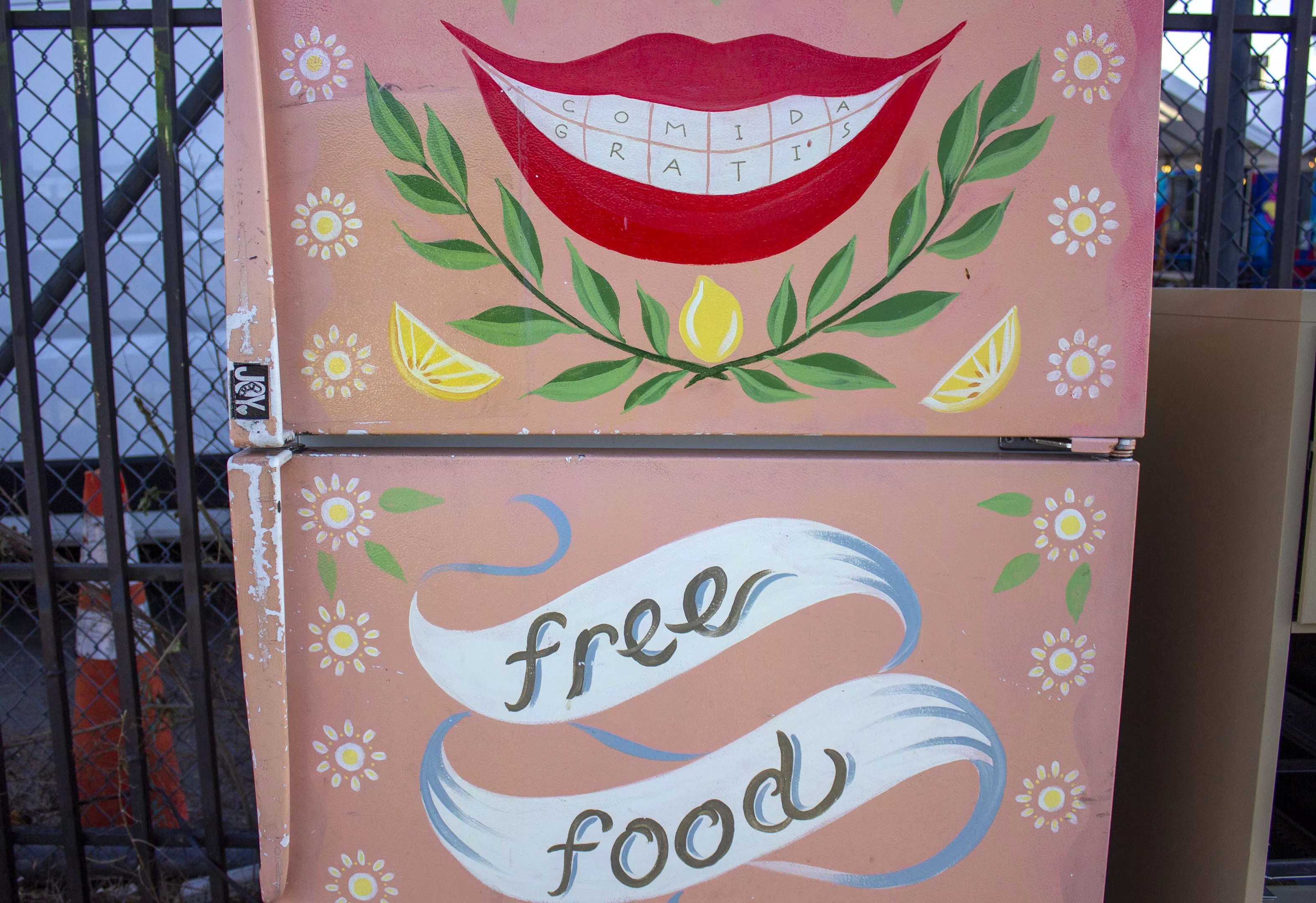 The concept is simple: Businesses host brightly colored refrigerators and dry-goods pantries outside their buildings that are stocked by neighborhood residents with food such as fresh produce, canned goods and pre-packed meals or hygiene supplies. Anyone who needs those items can pick them up for free 24 hours a day.