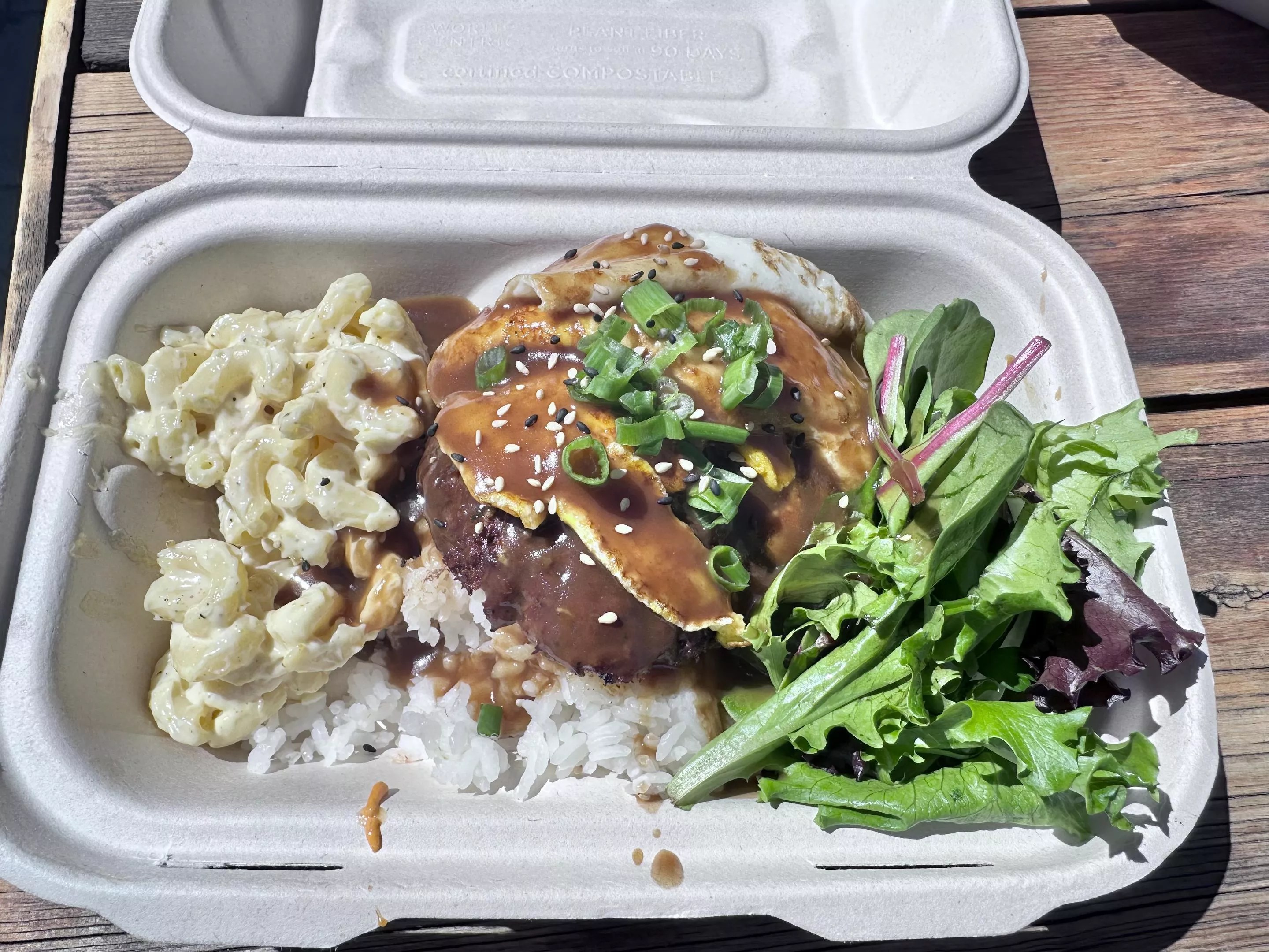 The Loco Moco with a side of mac salad.