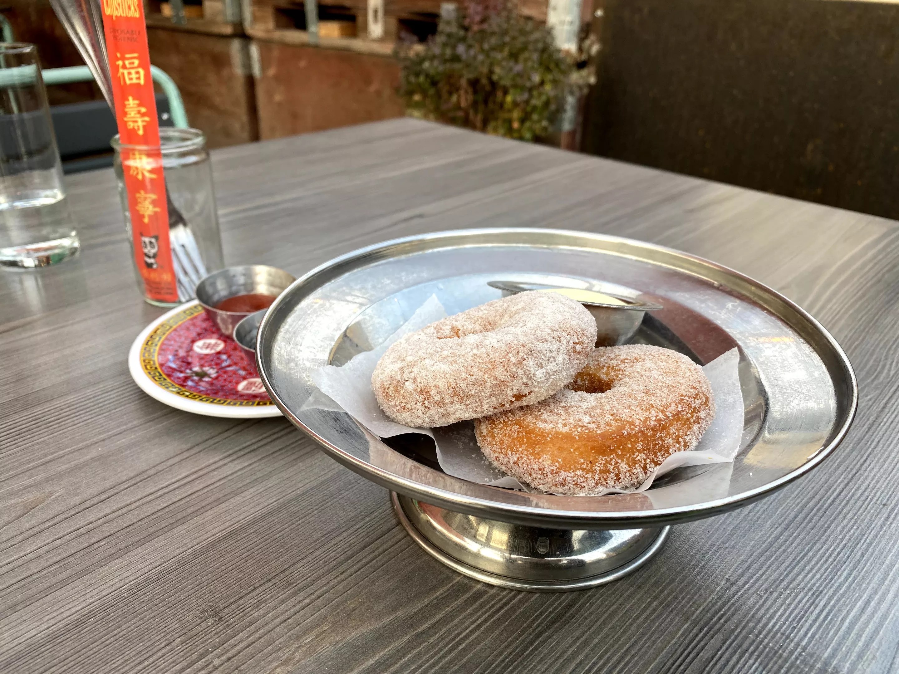 After some heated discussion about the large variety of happy hour offerings, we decided to start with two bao doughnuts ($1 each), because if there’s one thing we agree upon, it’s pastries. The sugared discs arrived freshly fried with a side of pudding-like crème Anglaise, and although I found nothing especially bao-like about the dough, and the Anglaise didn’t have much of the promised lime-leaf flavor, the Chinese five spice in the sugar dusting came through – but not so much that if you’re sensitive to anise flavors you’d really mind.