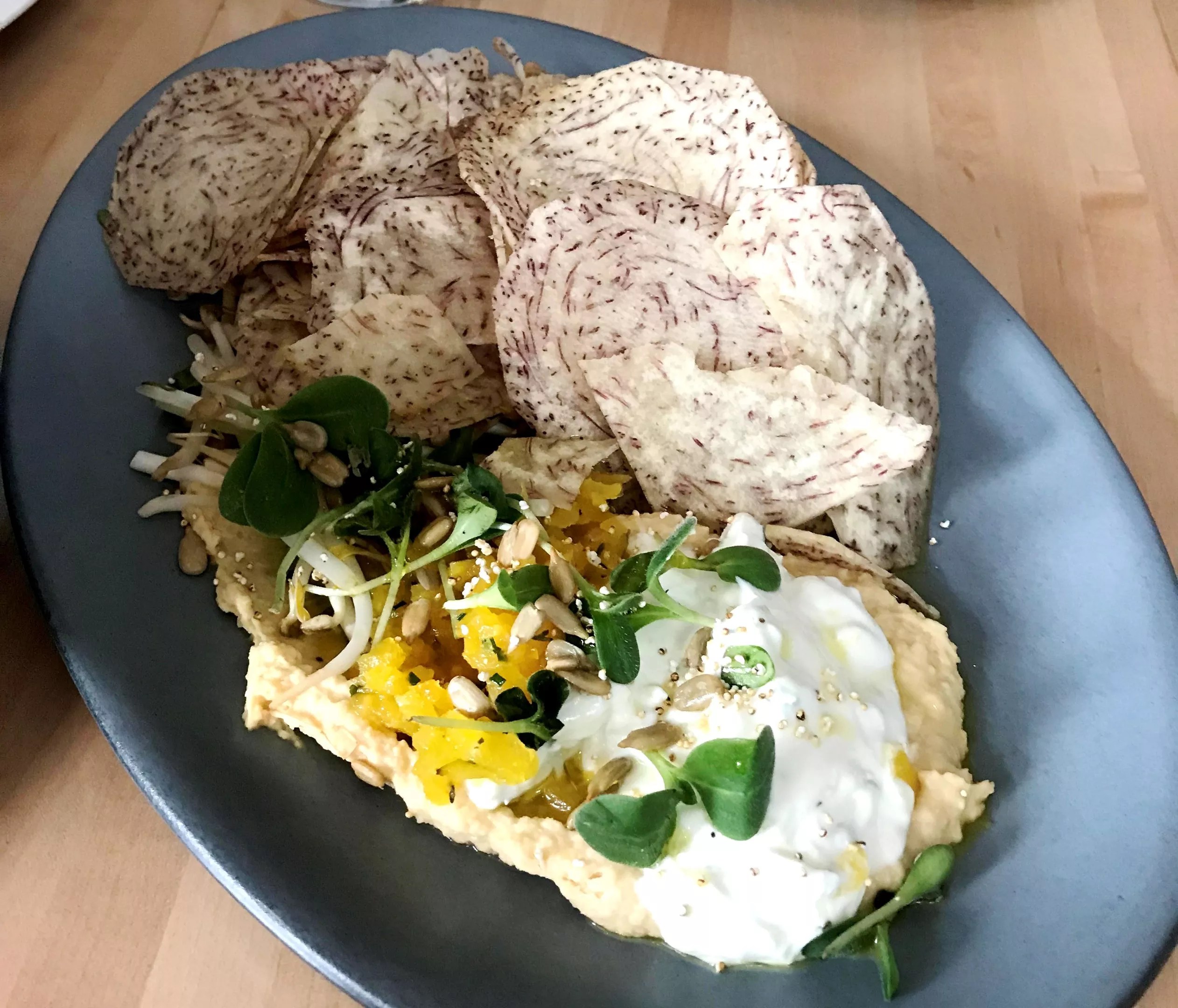By that point we were mostly satisfied and impressed. But primed with our second happy hour beverage, we found no issues polishing off a healthy serving of crunchy, salty taro chips and creamy accompaniments. The hummus, mild golden beet relish and creamy herb dip didn’t readily distinguish themselves, turning into a rather one-note chip-dip situation that was nonetheless satisfying.