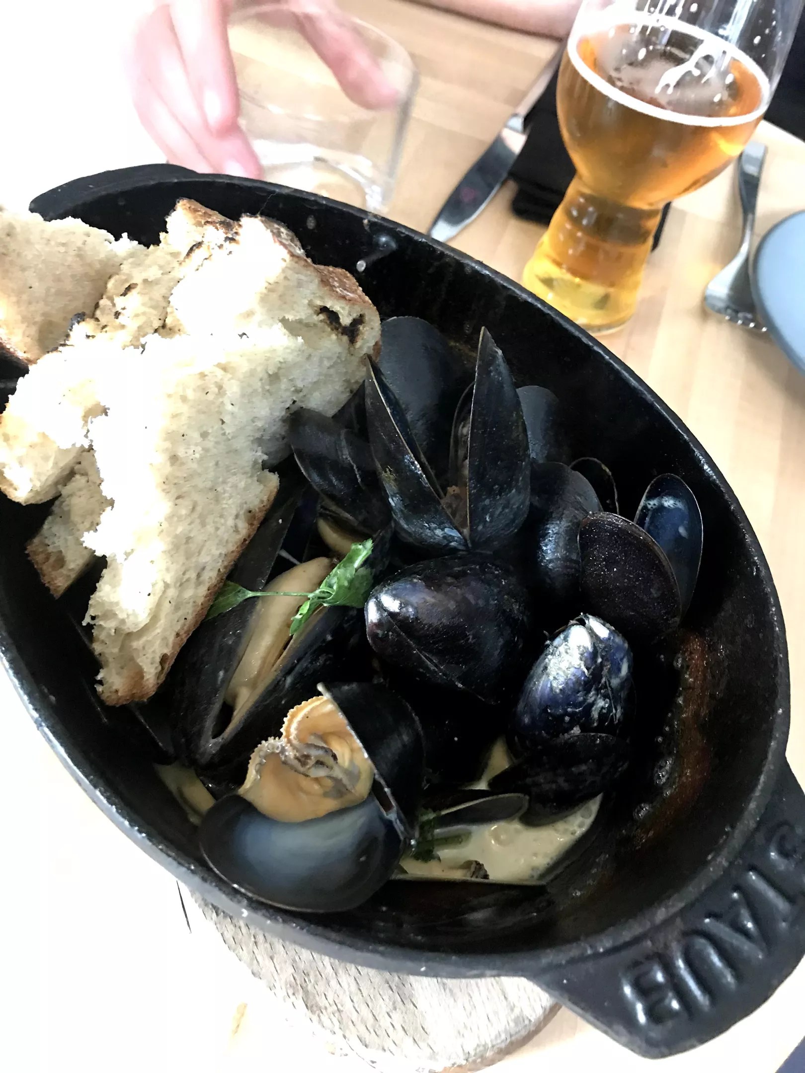 In addition to the balanced drinks list, Citizen Rail has made truly thoughtful selections from its main dinner menu, offering these well-executed plates in much larger portions than you might expect at the price, dishes that can definitely double as a light dinner. Of note are the potato cake with alder smoked sturgeon ($10), the mesquite-fired mussels ($10, $17 at dinner), and taro root chips with hummus and beet relish ($8). The mussels, something I rarely deign to order in this landlocked state, arrived in a scorching-hot cast-iron pot accompanied by grilled slices of hearty-yet-airy artisan bread. Hotly settled in their cream-based tarragon broth, the mussels have the absolute perfect amount of spice, such that my companions and I took turns shooing away the buser as we used our empty shells to shovel the last of the rich pool at the bottom of the pot.