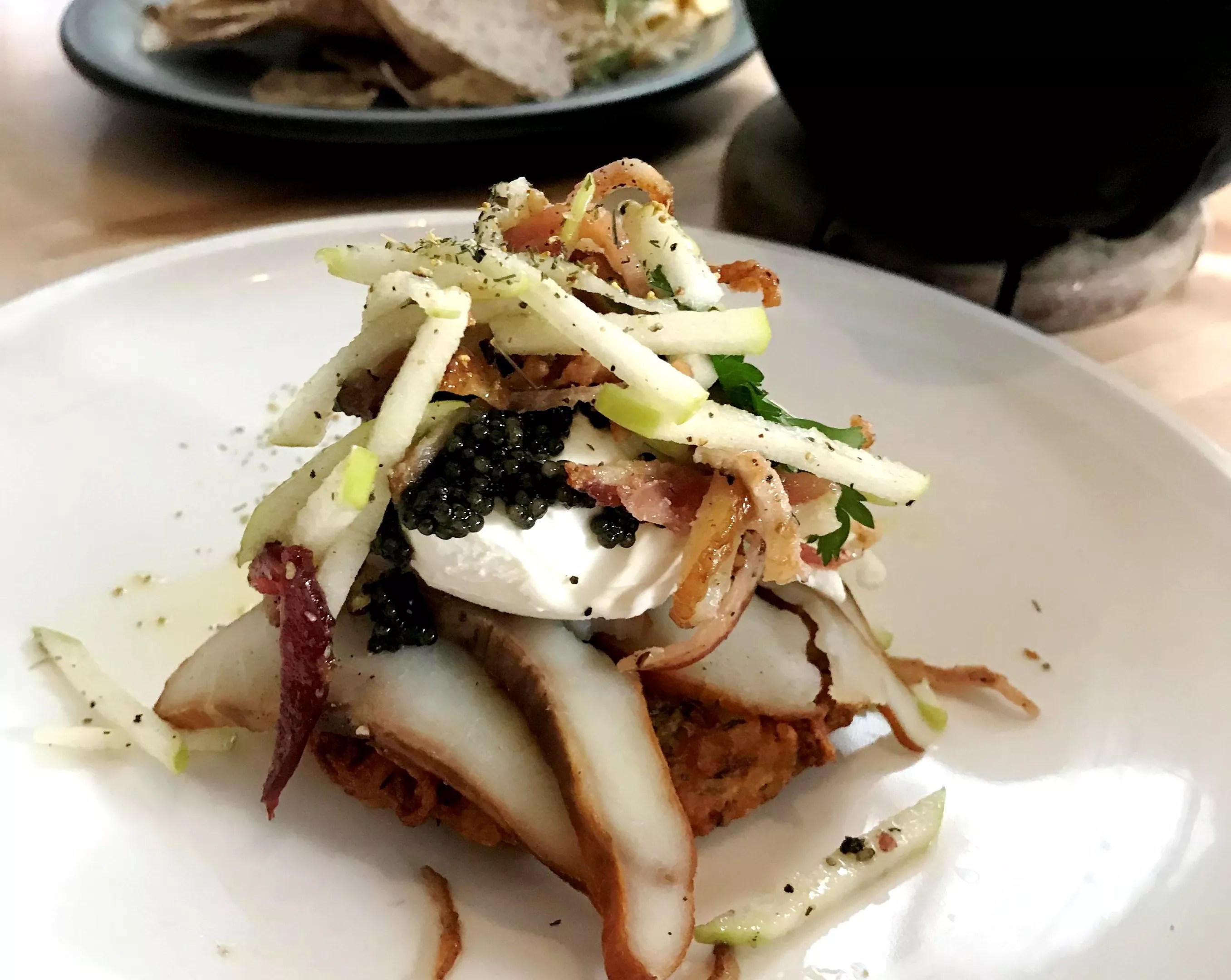 Next we tackled the potato cake, which, if you take potatoes seriously (and we do), proved worthy with its crispy-fried but delicate outer layer like a luxurious kimono, giving way to a tender, well-salted interior. And while the caviar was mostly lost in the creamy depths of the crème fraîche, the juicy strips of smoky bacon and tart green apple provided ample taste and texture variety. I found myself combining and recombining the flavors into a seemingly infinite array of bites, each distinct in its own right.