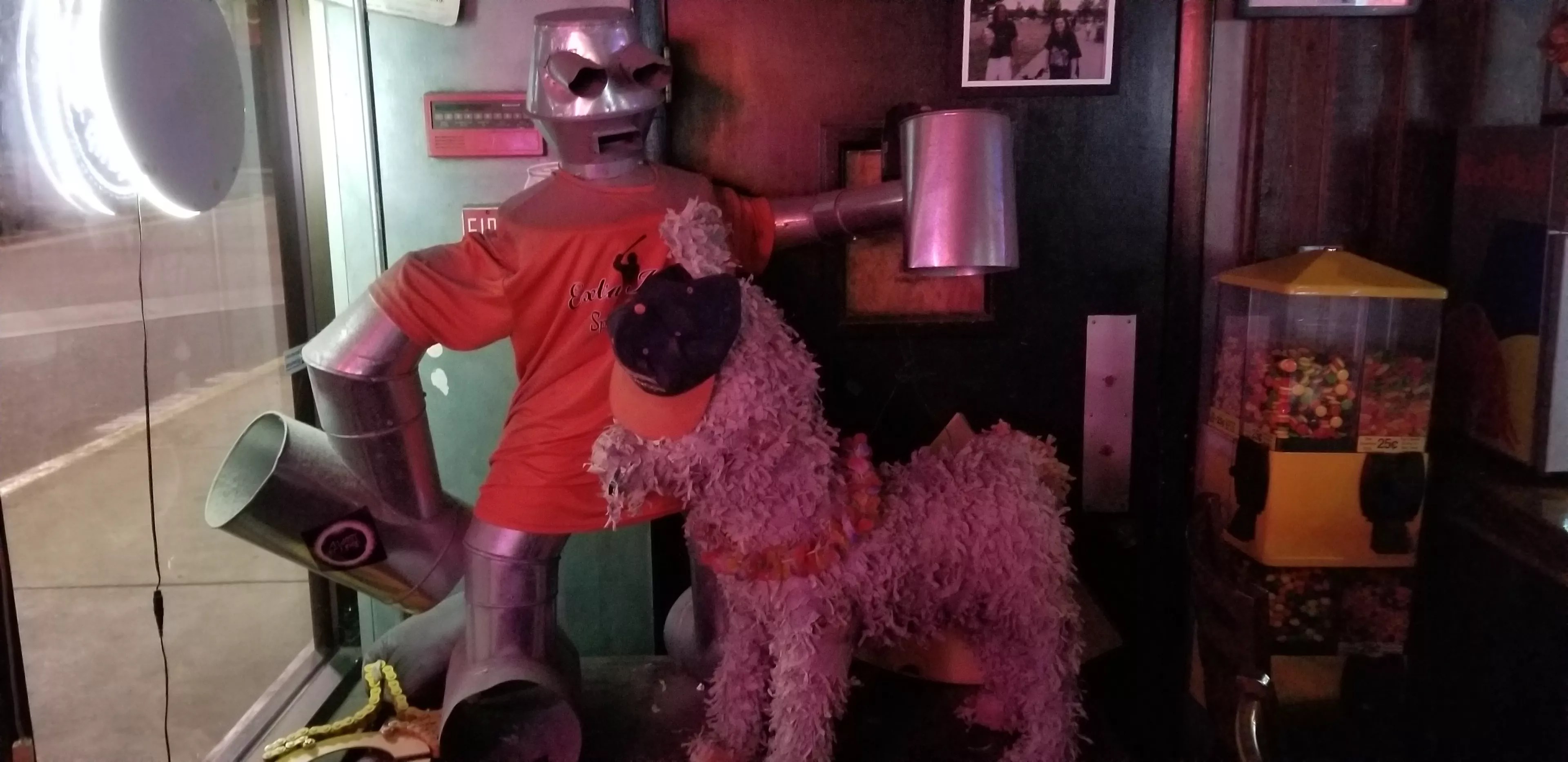 Corrugated steel and reclaimed wood – attempts at modernizing the bar – mixed with standard dive bar elements: threadbare carpet and a random assortments of chairs. One of the regulars, a metal fabricator, has contributed decorative touches, including a large tin man statue. Other random decorations – military flags, sports memoralia, an antelope head – all had back stories that in some way honored other regular customers. Packers fans are welcome at Extra Innings, according to this tin man and his dog companion. Sarah McGill