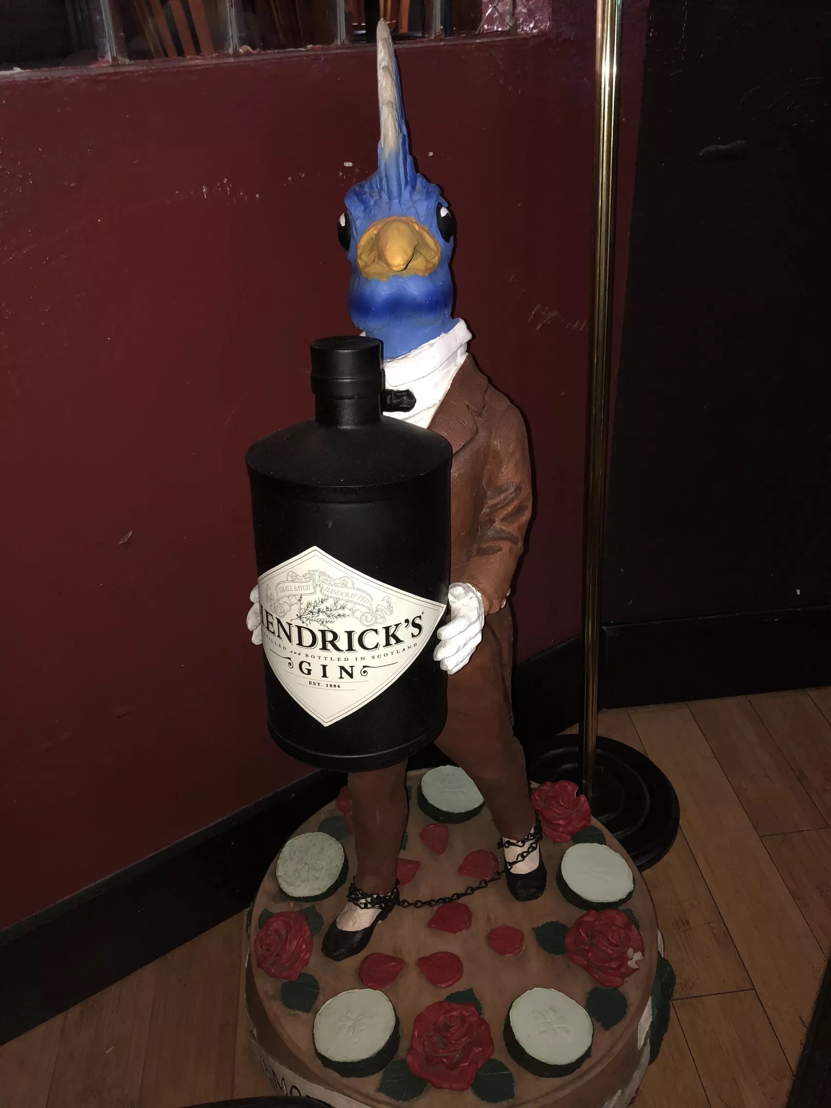 I love a good promotional liquor statue, and Barricuda’s has one I haven’t seen before, this bird that advertises Hendrick’s gin.