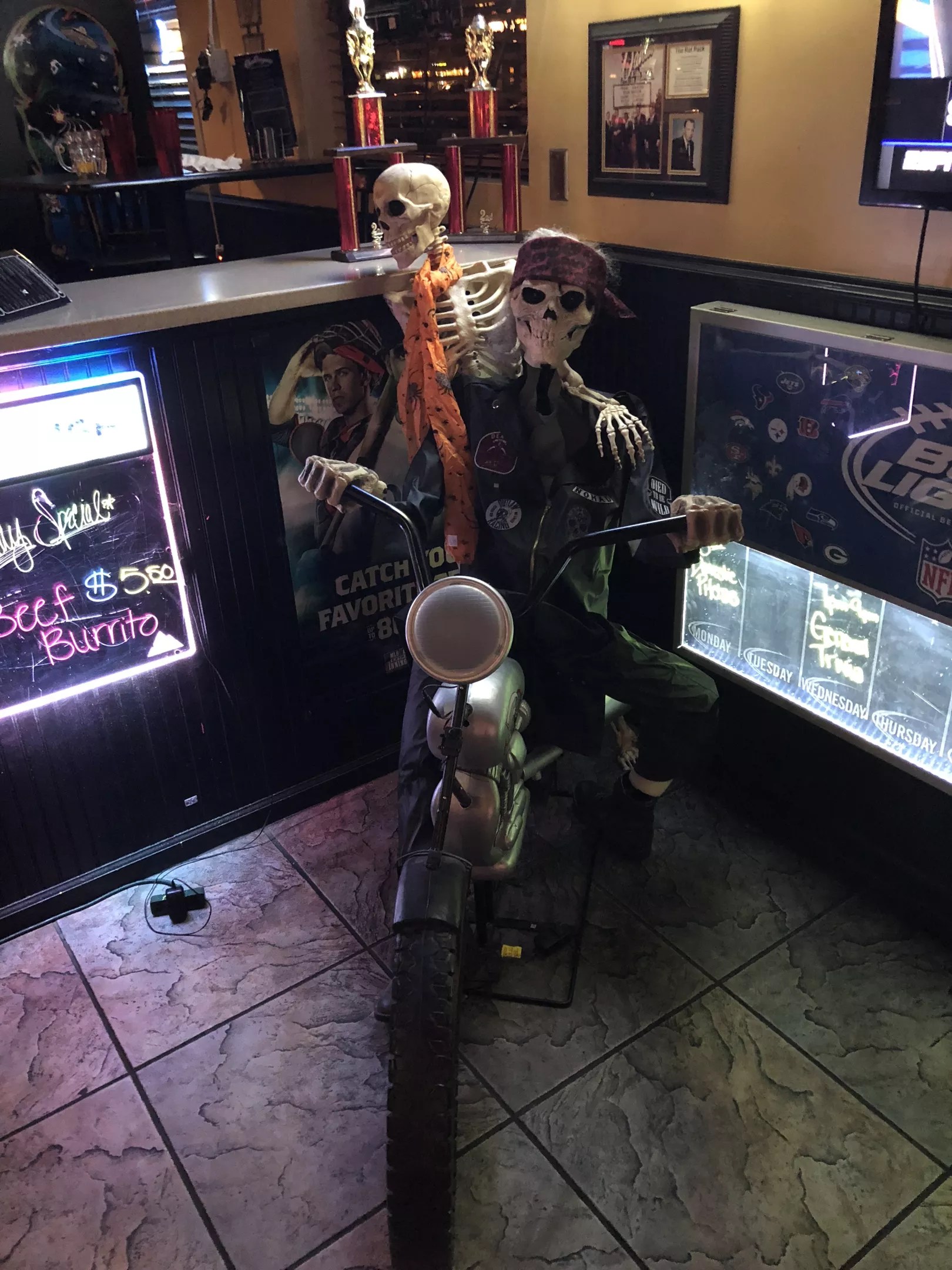 The place was jam-packed with folks in Broncos gear loudly cheering on the hometown team when we arrived. The packed interior erupted into boos and cheers, depending on the on-screen action, while a few dissenting Kansas City fans made noise as well – but everyone was in high spirits. Every seating area was full: the little area near the pool tables, the booths along the wall and all sides of the rectangular bar in the center of the large space. More orange could be found in the festive Halloween decorations, along with many ghosts hanging from the ceiling and skeletons perched around the room.