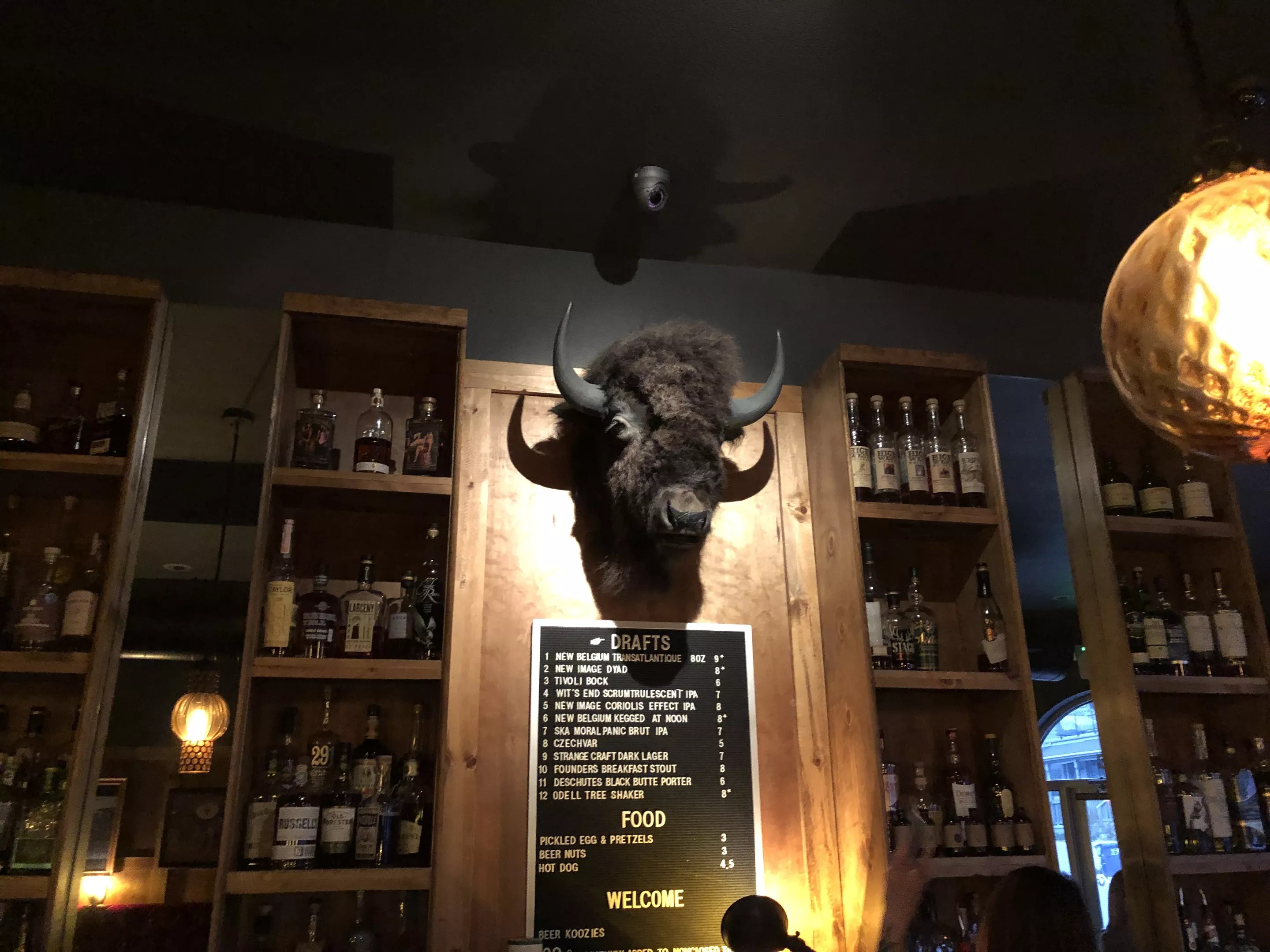 Inside, the High Lonesome feels more spacious than it is, mostly because of the spare and plain decor and the high ceilings. Bare walls painted gray add to the sleek, modern vibe, and behind the bar, custom shelves of pale wood hold an extensive collection of liquor bottles. A taxidermied buffalo head looks down over the wall-mounted beer list, adding a vintage touch. Amber glass light fixtures, leather booths and framed pictures of cowboys suggest old Colorado dive bars, but this is clearly not a dive bar. In fact, it feels more like it could have been created by Bobby Berk, the interior designer on the Netflix makeover show Queer Eye (which I strongly recommend watching – even if you never set foot in the High Lonesome – to help you try harder to be your best self).