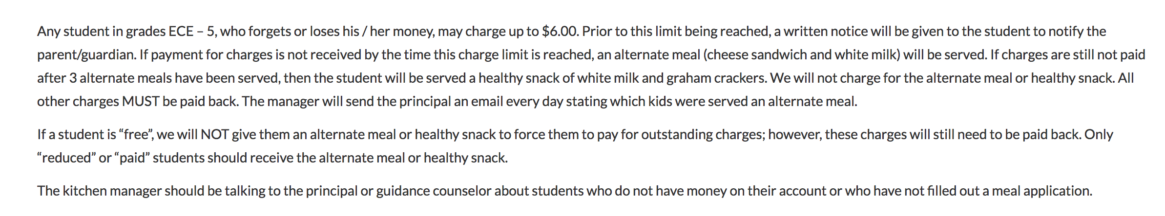 Furthermore, under DPS policy, outstanding debts carry over between school years and between schools within the district. So in August, students in debt will start the school year receiving nothing more than graham crackers and milk as their mid-day sustenance.