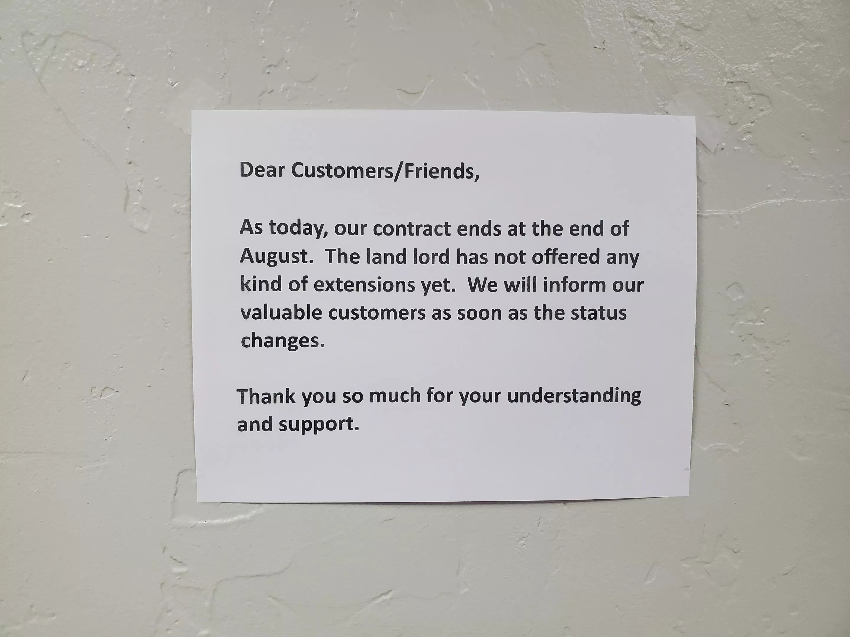 “We will inform our valuable customers as soon as the status changes,” the sign notes, and an employee working the counter on June 6 said there are no updates yet.