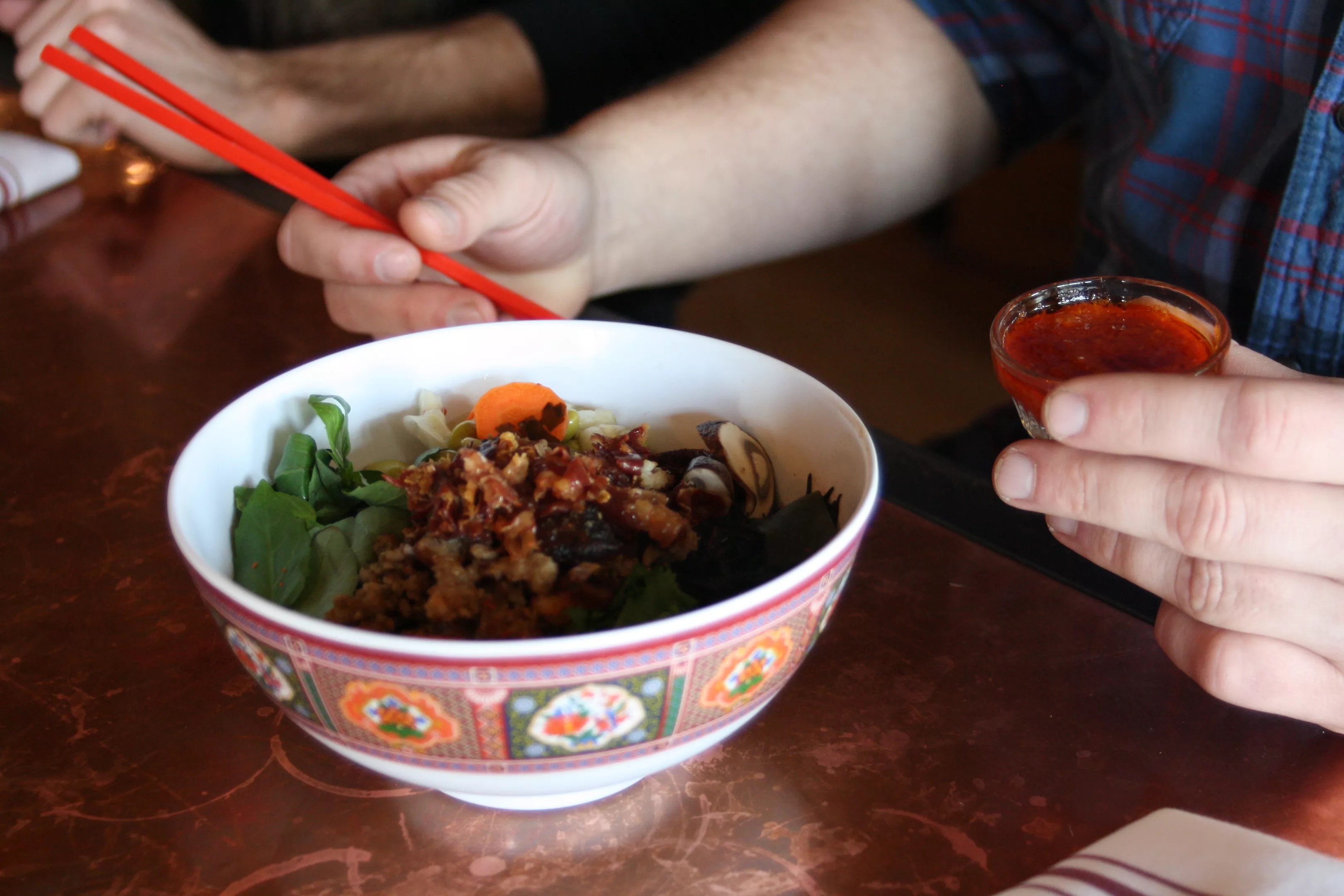 Lopiccolo serves two types of ramen bowls: mushroom and pork. The mushroom ramen has a red miso-lemongrass broth that gets additional flavor from veggie scraps that have been roasted on sheet trays. The broth and noodles are topped off with a seaweed salad, marinated vegetables, kimchi, a soft-boiled egg and mushrooms he finds each Sunday morning at Pacific Mercantile Company downtown. The egg can be left out to make the ramen vegan.