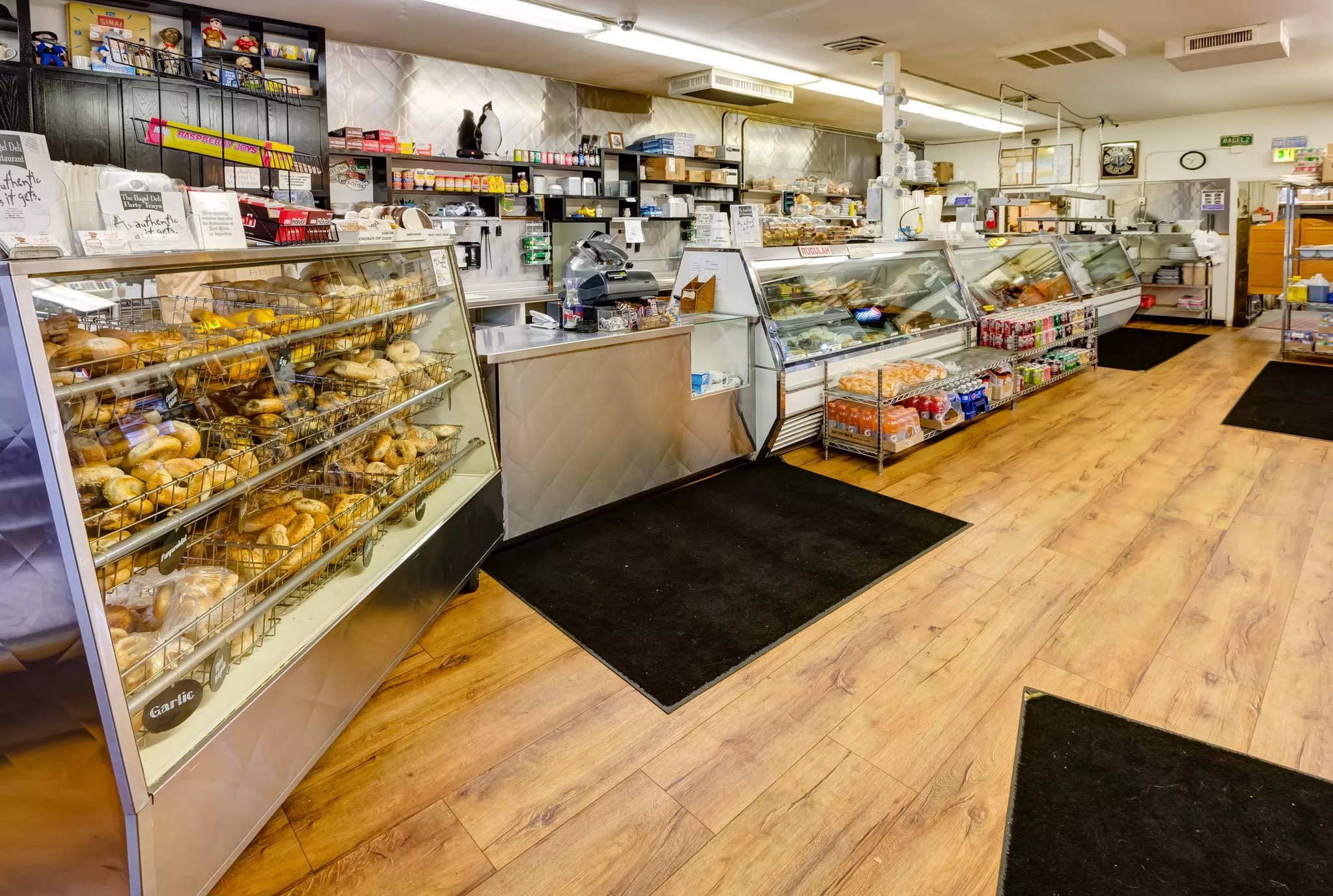 One part of the Bagel Deli is a market while the other half is a dining room.