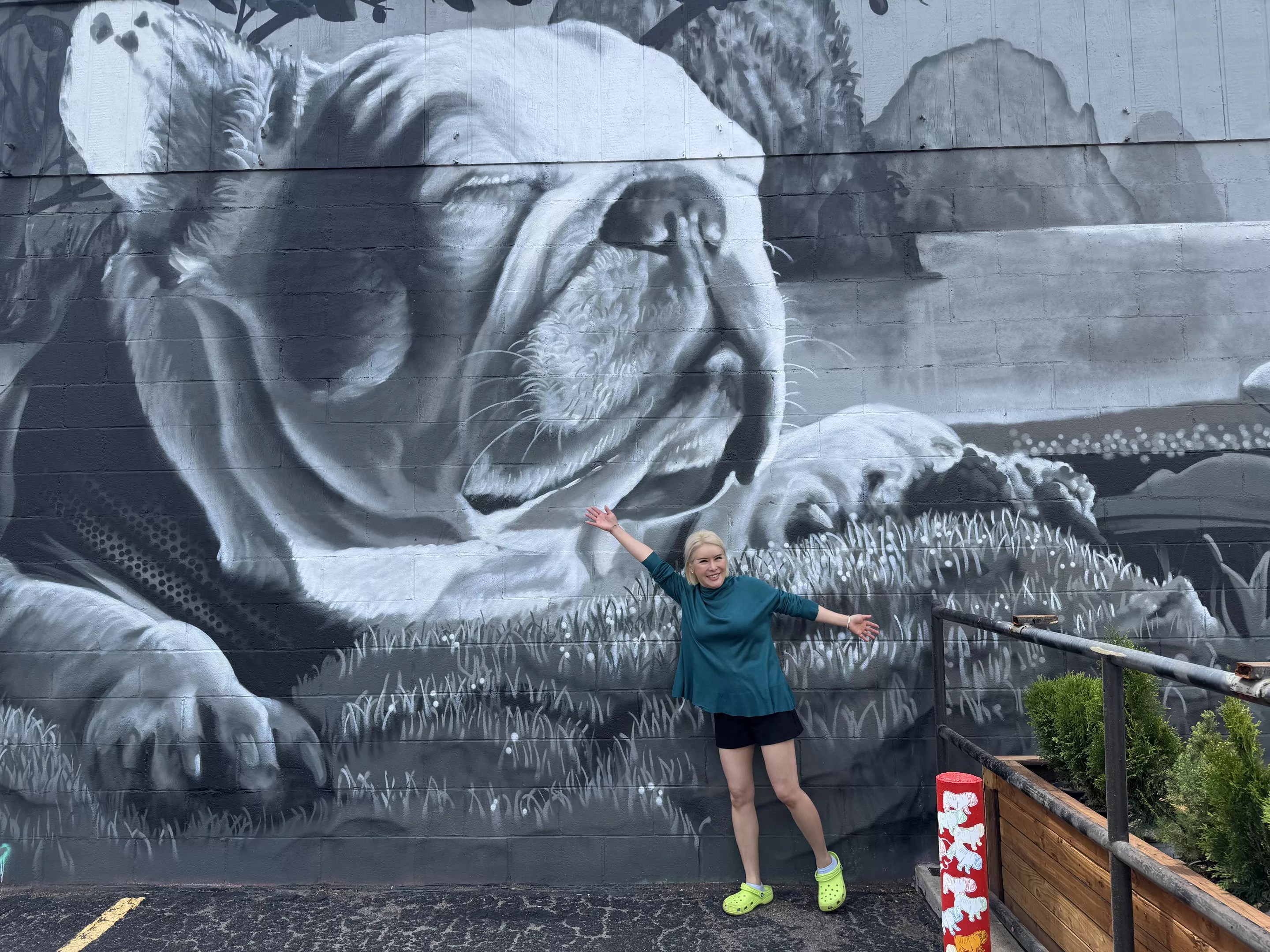 Kamolrat “Ploy” Limpapath in front of the mural on the side of her building done by Patrick Kane McGregor