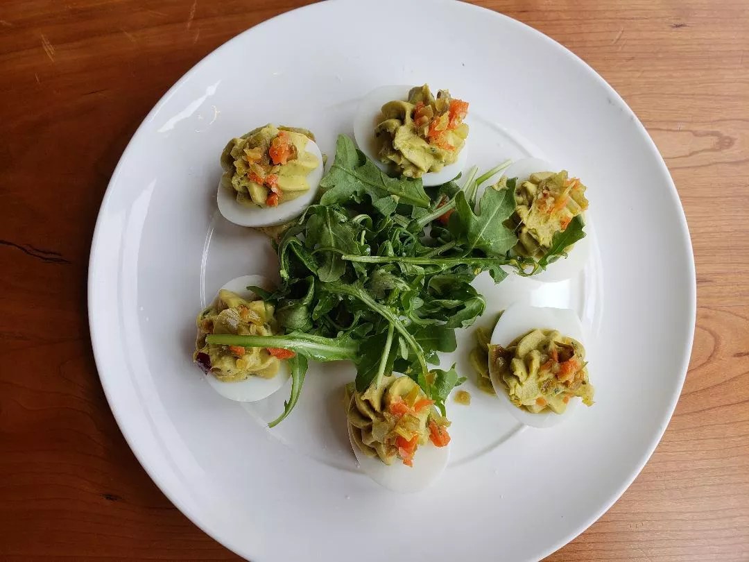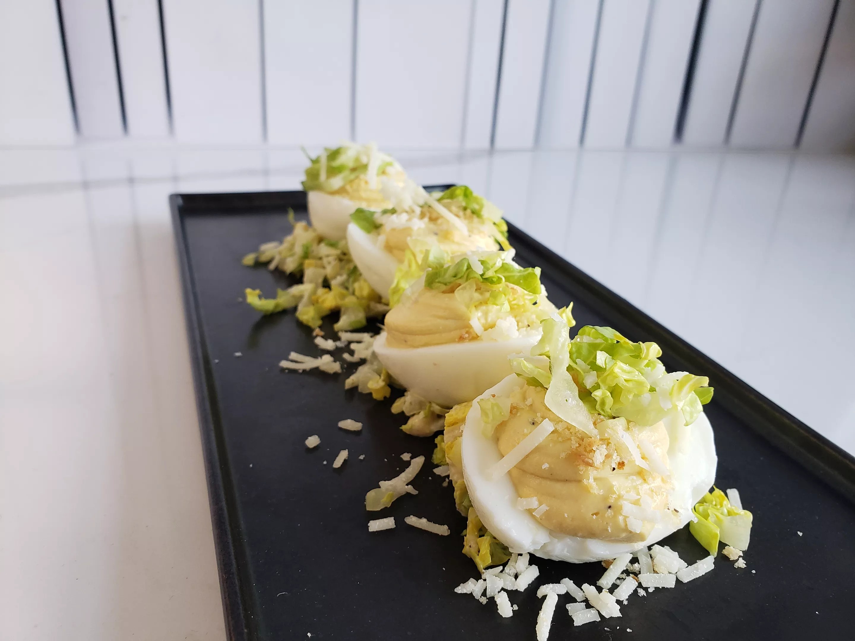 Fried chicken specialist Max’s Wine Dive might be all about the bird, but you can’t have the chicken without the egg. Hence the deviled eggs on the brunch and dinner appetizer menu. But unlike your usual Southern-style deviled egg, this one has an innovative touch. The cooked whites are rolled in potato flakes and then deep fried, giving each creamy bite a crunchy, hot shell with a creamy yolk topping. Think scotch egg meets deviled egg with a side of housemade pickles and dill aioli. And, if you really want to make a meal out of the dish, add smoked salmon or crabmeat on the side. maxswinedive.com Caesar salad deviled eggs at Narrative in Cherry Creek. Linnea Covington