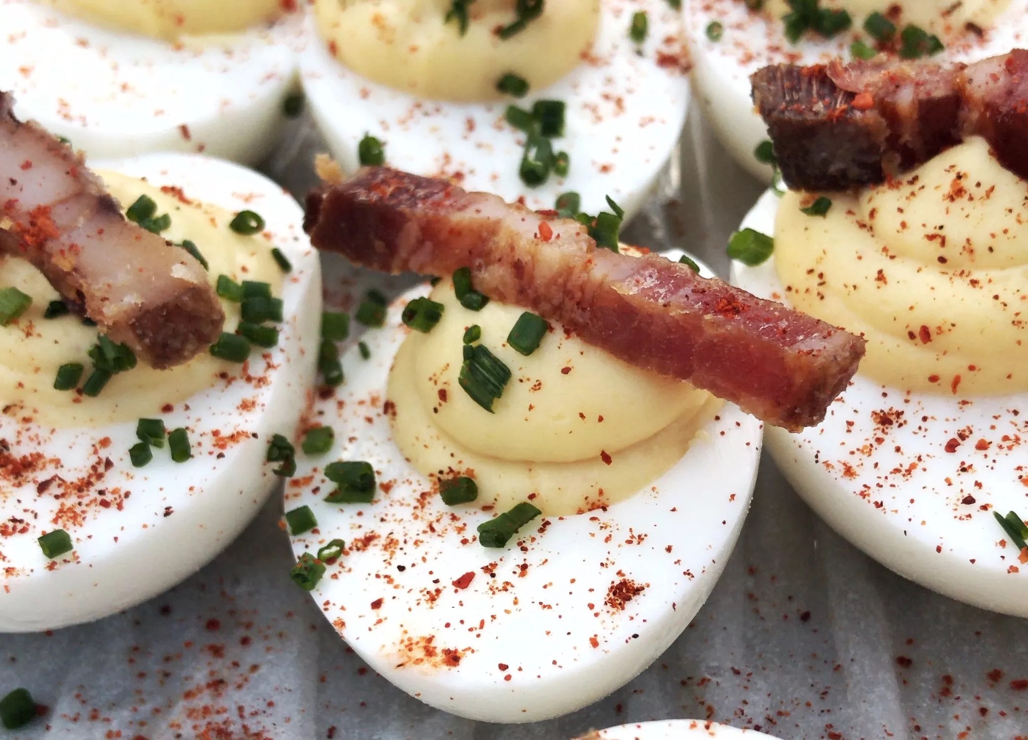 At all three Tacos Tequila Whiskey locations – East Colfax, West Highland and Governor’s Park – of this trendy taco shop, guests can indulge in chipotle-infused deviled eggs during the daily happy hour from 3 to 6 p.m. (and all day on Mondays). Each $3 order comes with three eggs loaded with diced onion, fresh cilantro, a sprinkling of cotija cheese and crisped chorizo. Smoky chipotle adds slow heat balanced by the velvety creaminess of the huevos. As a bonus, the deviled eggs go great with another happy-hour favorite: the Pinche signature margarita. tacostequilawhiskey.com The deviled eggs at Urban Farmer come topped with bacon. Urban Farmer