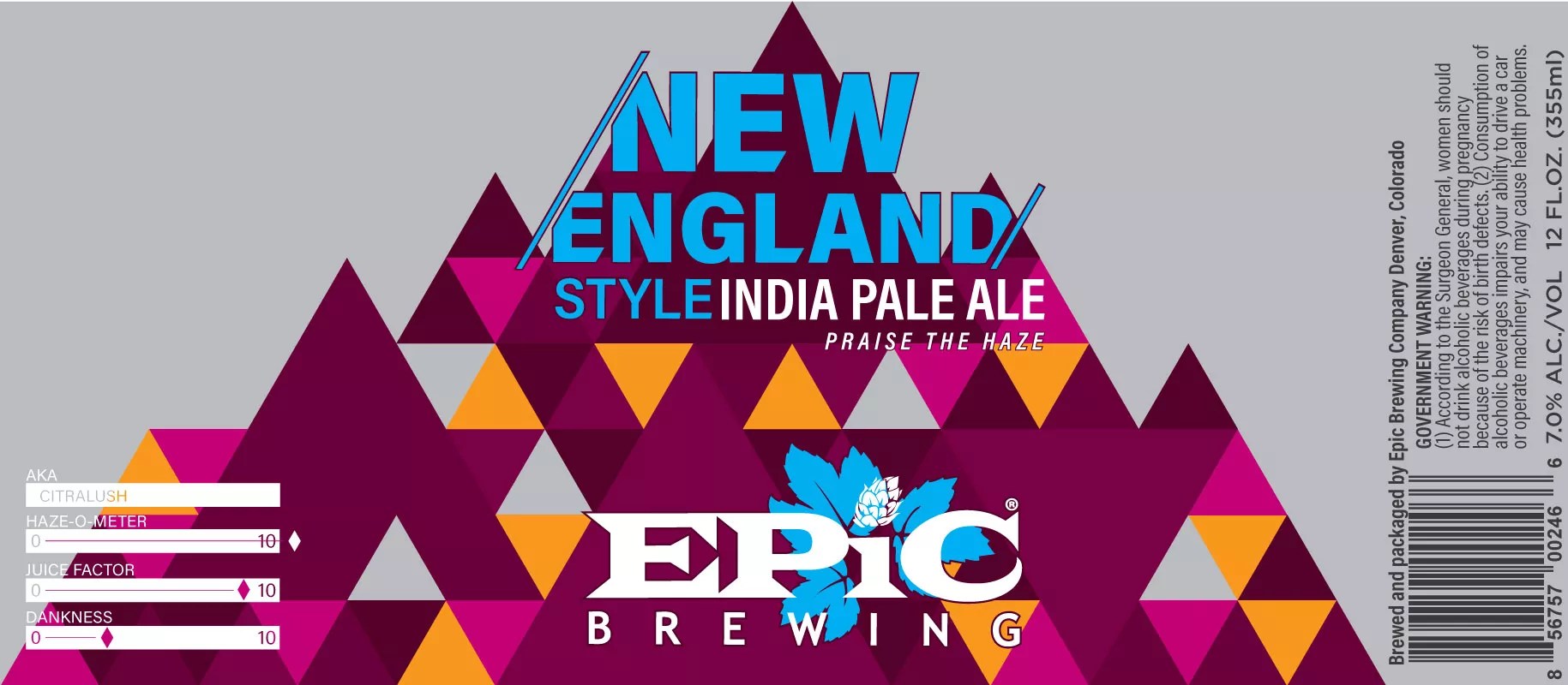 The different versions will also carry sub-names, like Citralush, which is available in Epic’s taproom right now and will likely be its first canned New England-Style IPA, followed by Cumulus. Citralush, made with Citra and Mosaic hops, is very hazy, a little more bitter than typical for the style, and very juicy. To help consumers differentiate, Epic will alter the labels slightly with different colors and sliding scales measuring “Dankness,” “Juice Factor,” and “Haze-O-Meter.”