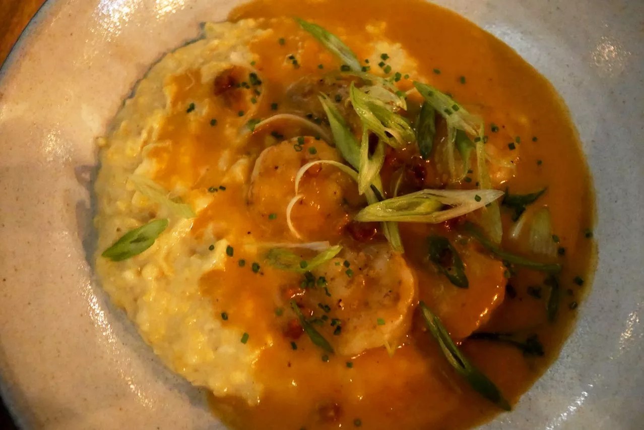 Cheesy shrimp and grits with tomato-bacon gravy.