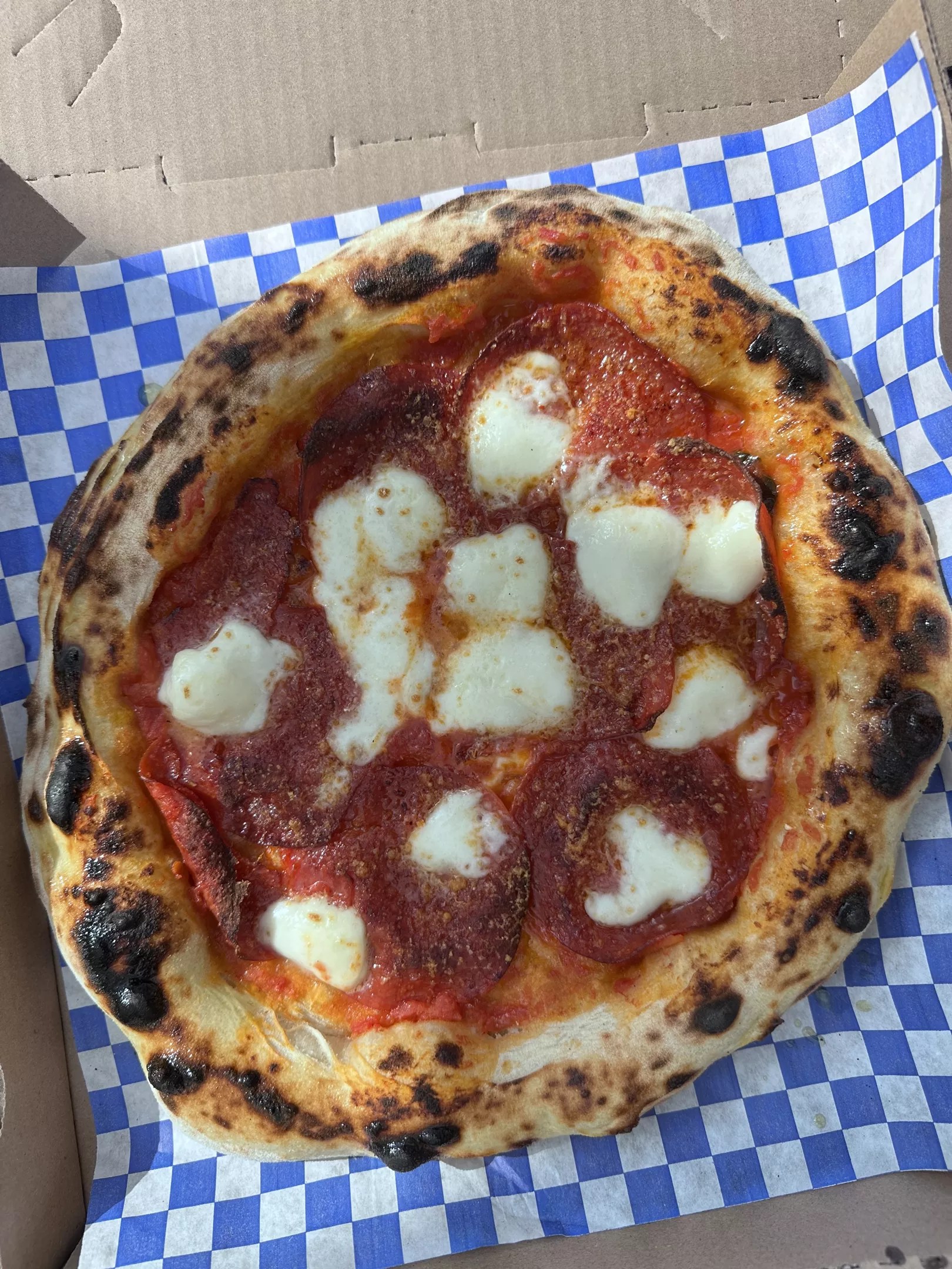 Since then, Nano’s Pi has grown slowly and steadily. Hernandez now books multiple dates each week, aiming to operate four to five days consistently. His dough, a 48- to 60-hour process using Italian Caputo flour, yields a crust that is light, airy, chewy and deeply flavorful. “I really try to follow the Neapolitan classic style as much as possible,” he says. Everything is 100 percent Caputo. I do a 24-hour poolish and then a 24-hour cold bulk fermentation. When people are eating it, they’re probably eating a 60-hour dough. Super hydrated, it’s either 75 percent or above,” Hernandez explains.