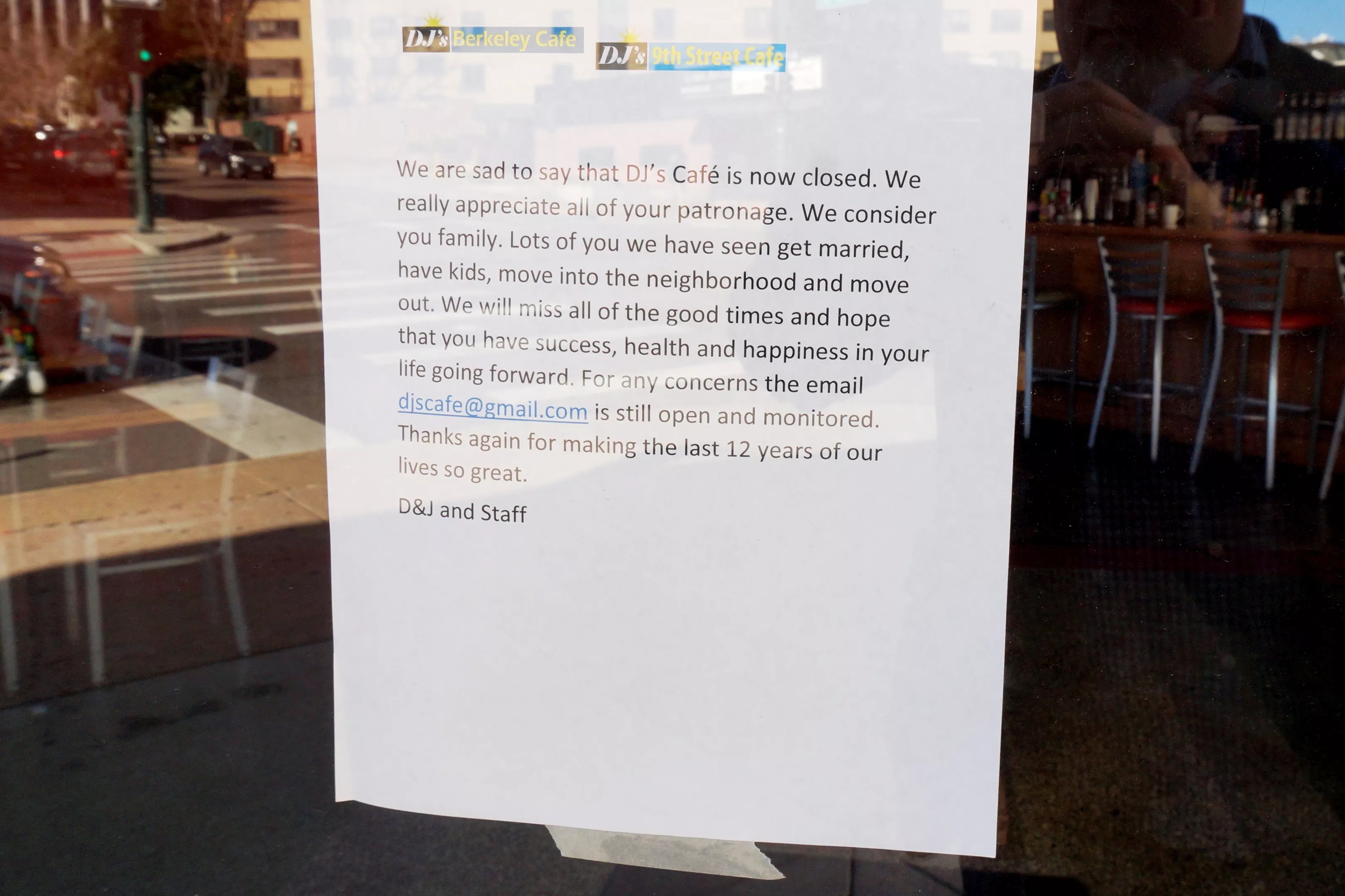 Customers looking for a hot breakfast and a cup of coffee at DJ’s 9th Avenue Cafe (865 Lincoln Street) this morning were instead greeted by a note on the door explaining that the breakfast eatery is now closed. The sign reads: “Thanks again for making the last 12 years of our lives so great,” an indication that the original DJ’s Berkeley Cafe, at 3838 Tennyson Street, is also closed.