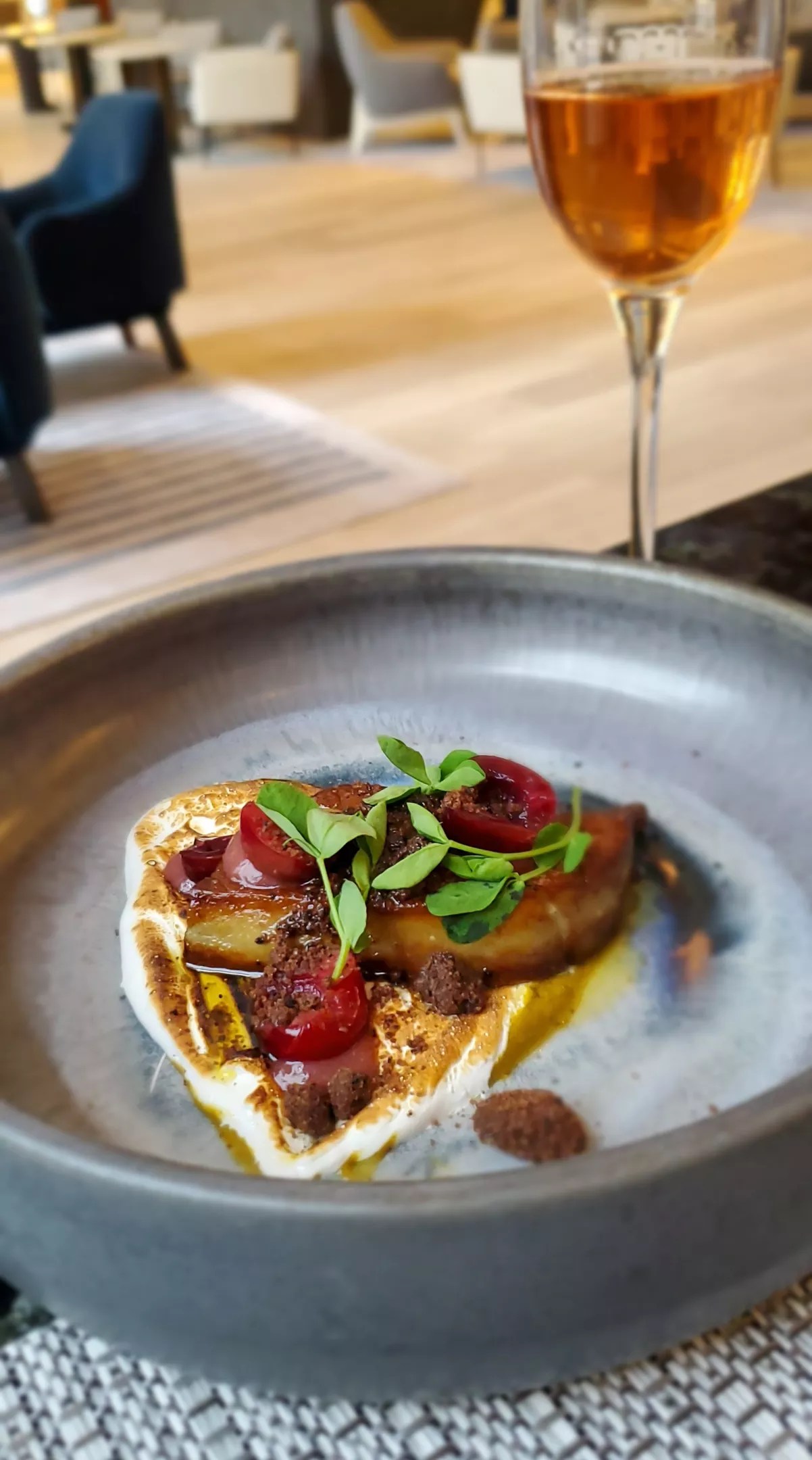 Food should “bring your own story in” with your guests, Biederman says of her culinary approach, “even though we’ve never met.” You can see that sentiment in the foie gras appetizer, where she uses flavors inspired by the Fluffernutter sandwiches that her mom used to make. The result: seared Hudson Valley foie gras on top of toasted pistachio and fennel pollen meringue that looks like marshmallow fluff but tastes far more complex and savory. The dish is finished with a dusting of salty “espresso soil,” as well as rhubarb and pickled Rainier cherries, an homage to the fact that her mother used to add jelly to the classic sandwich “because she was fancy.”