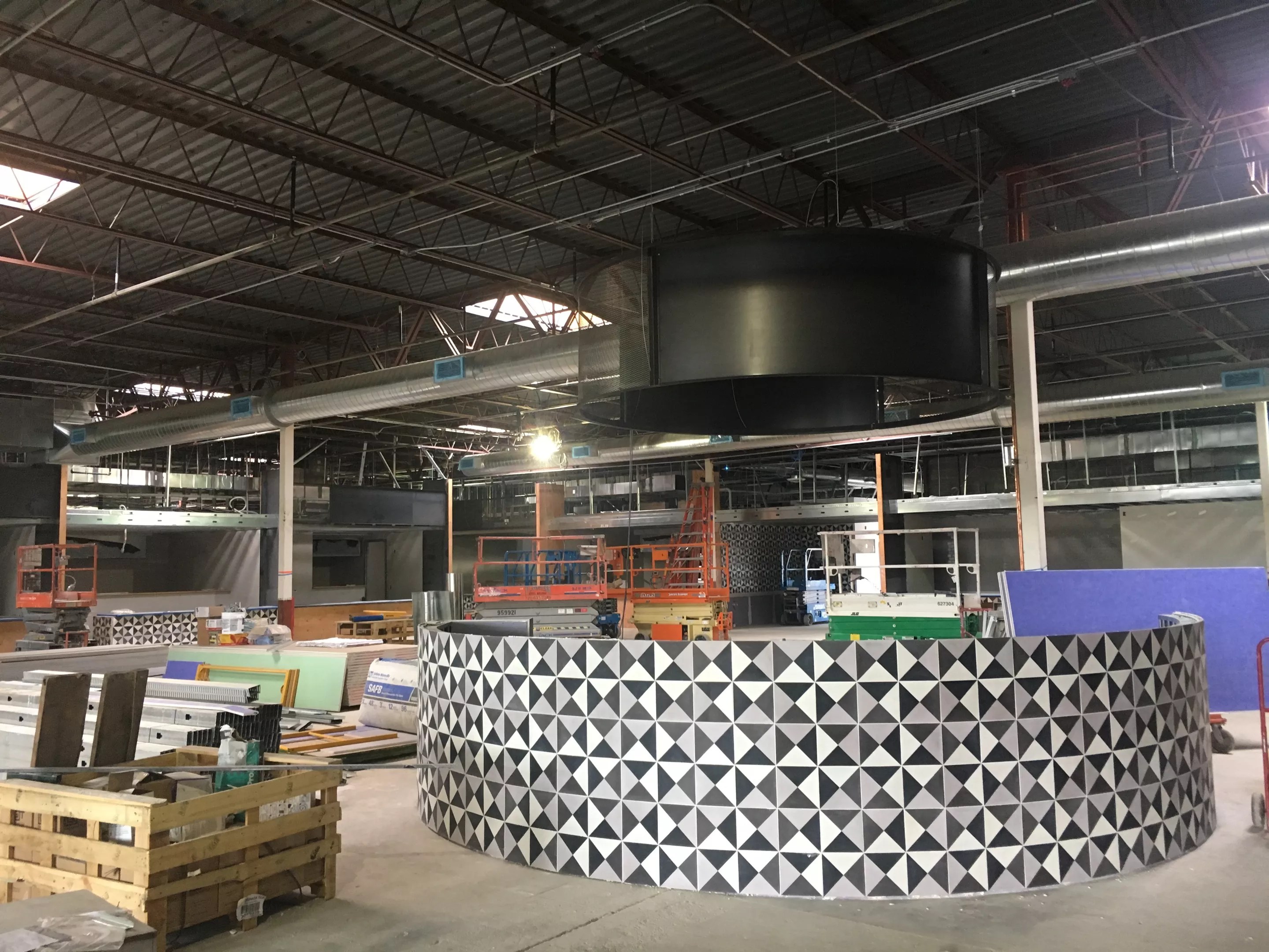 The west end of the hall will be occupied by a number of retail businesses, including Depew Liquor (which is moving from its longtime home at the far end of the parking lot), Queen City General Store, Zero Market (which also has a store at Stanley Marketplace), Fleur d’ Henri (which makes CBD products), My Make Studio (a decorate-your-own cake shop) and Velvet Wolf, Timber Wolf and Little Wolf (boutique clothing for women, men and kids, respectively).