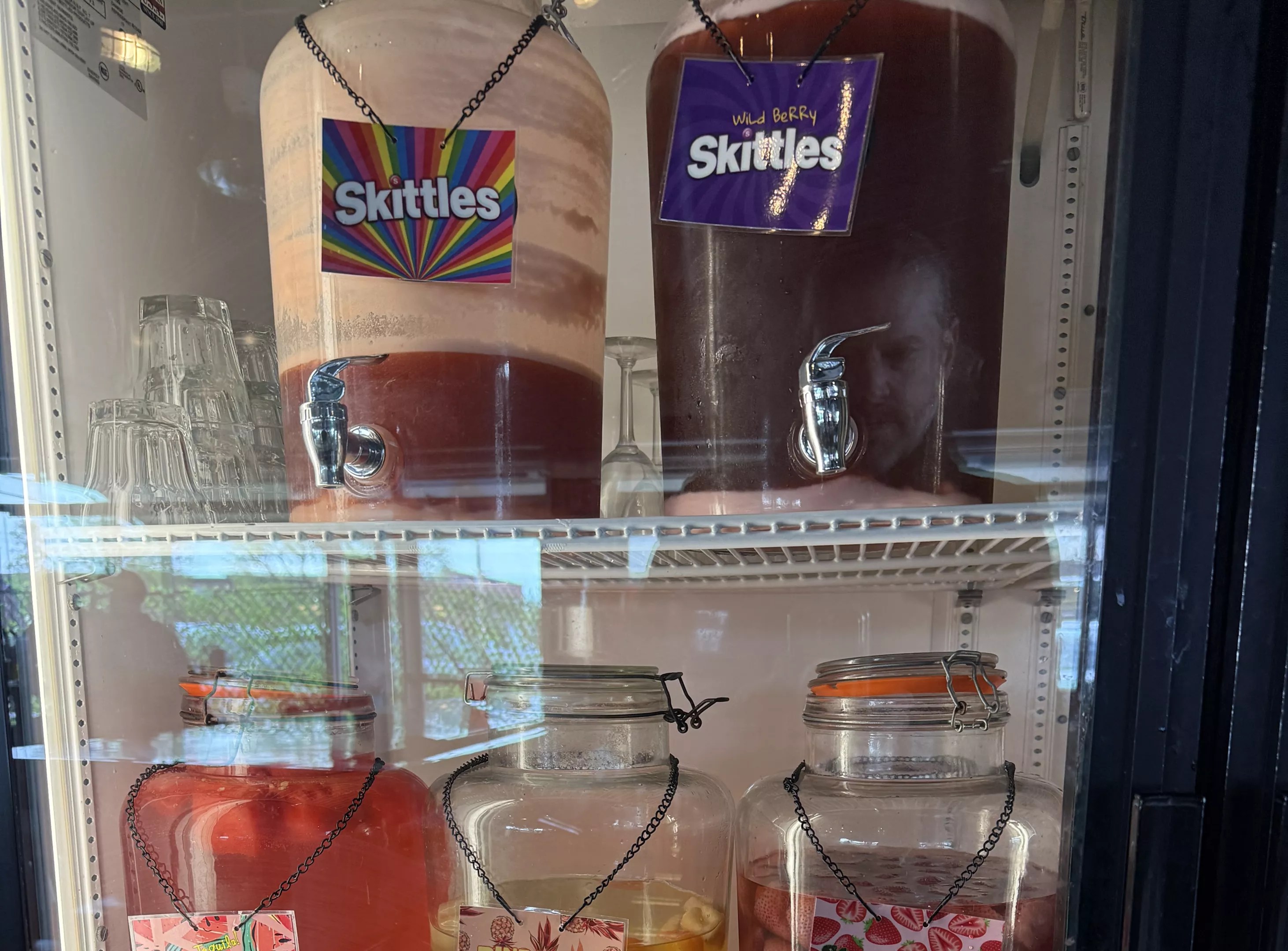We weren’t there to drink, either, but we couldn’t help but notice the glass-doored refrigerators with vats of bright-colored infused spirits, primarily vodka – mostly candy infusions, like Starburst and WarHeads and Jolly Rancher, along with pepperoncini, pickle, jala-pickle, and peanut butter and jelly flavors.