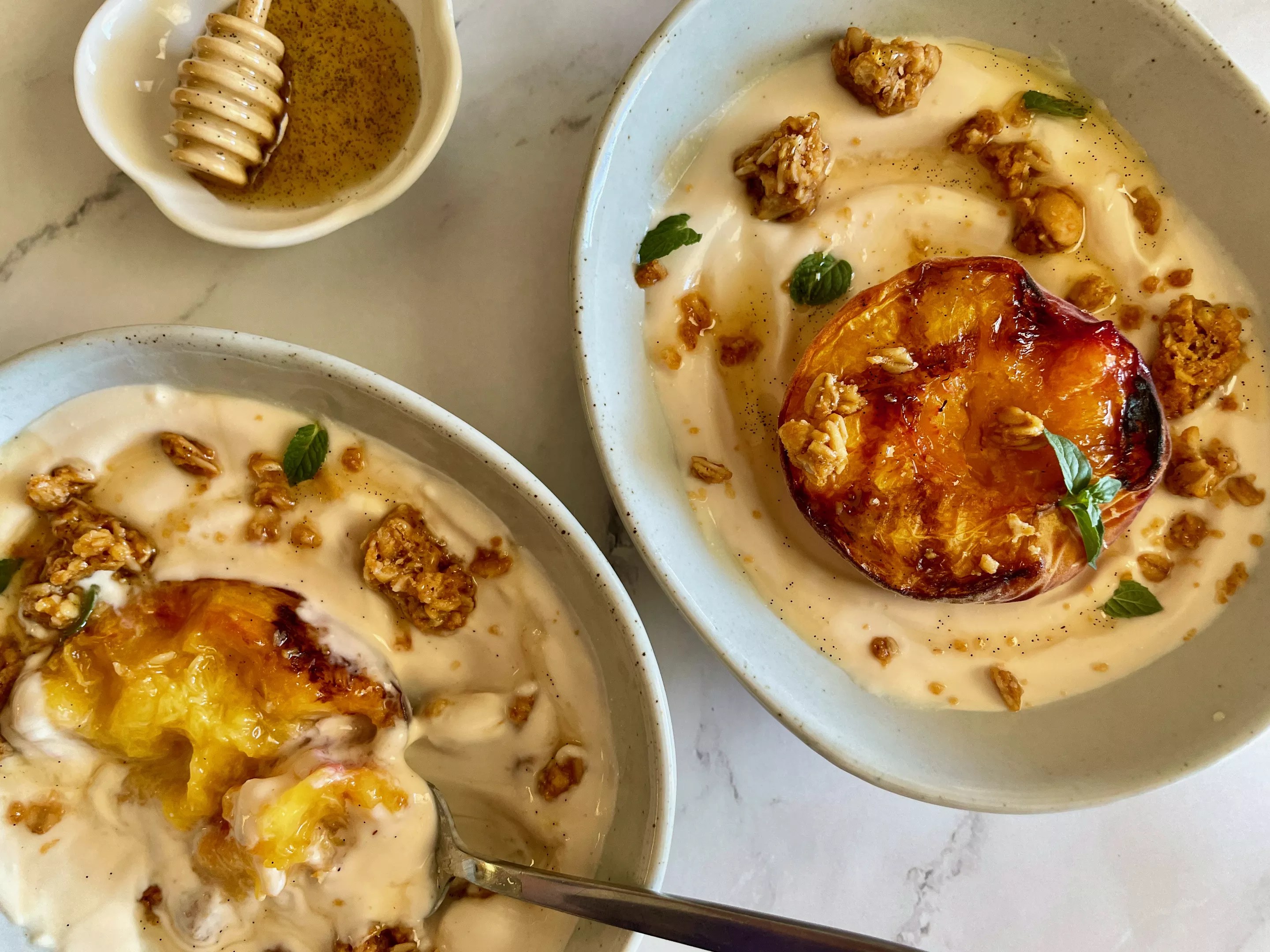 Grilled peaches, pictured served on yogurt and topped with mint leaves, granola clusters and Bjorn’s vanilla bean-infused honey.
