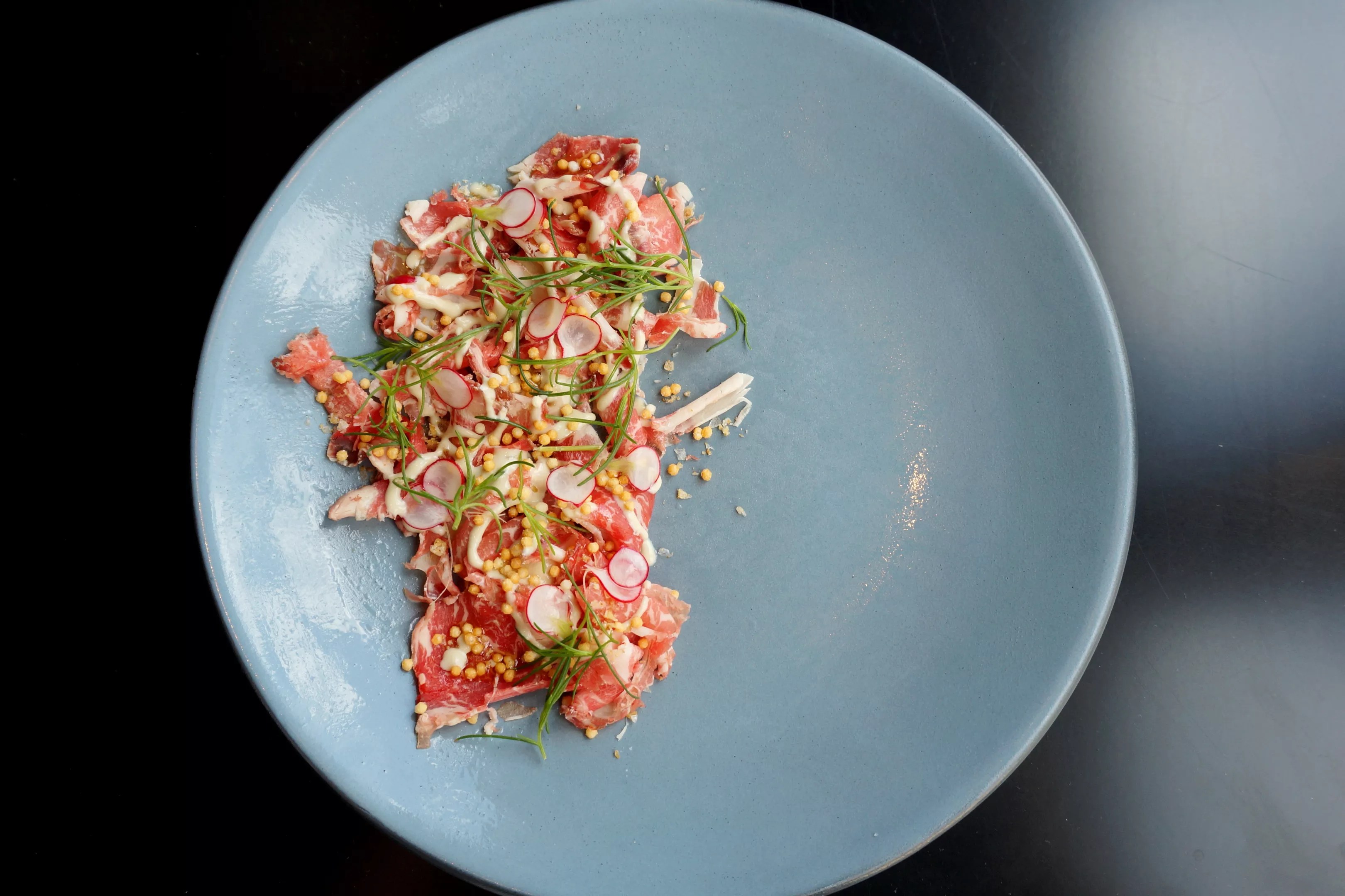 Dry-age beef carpaccio with raw oysters served on an ice-cold plate.