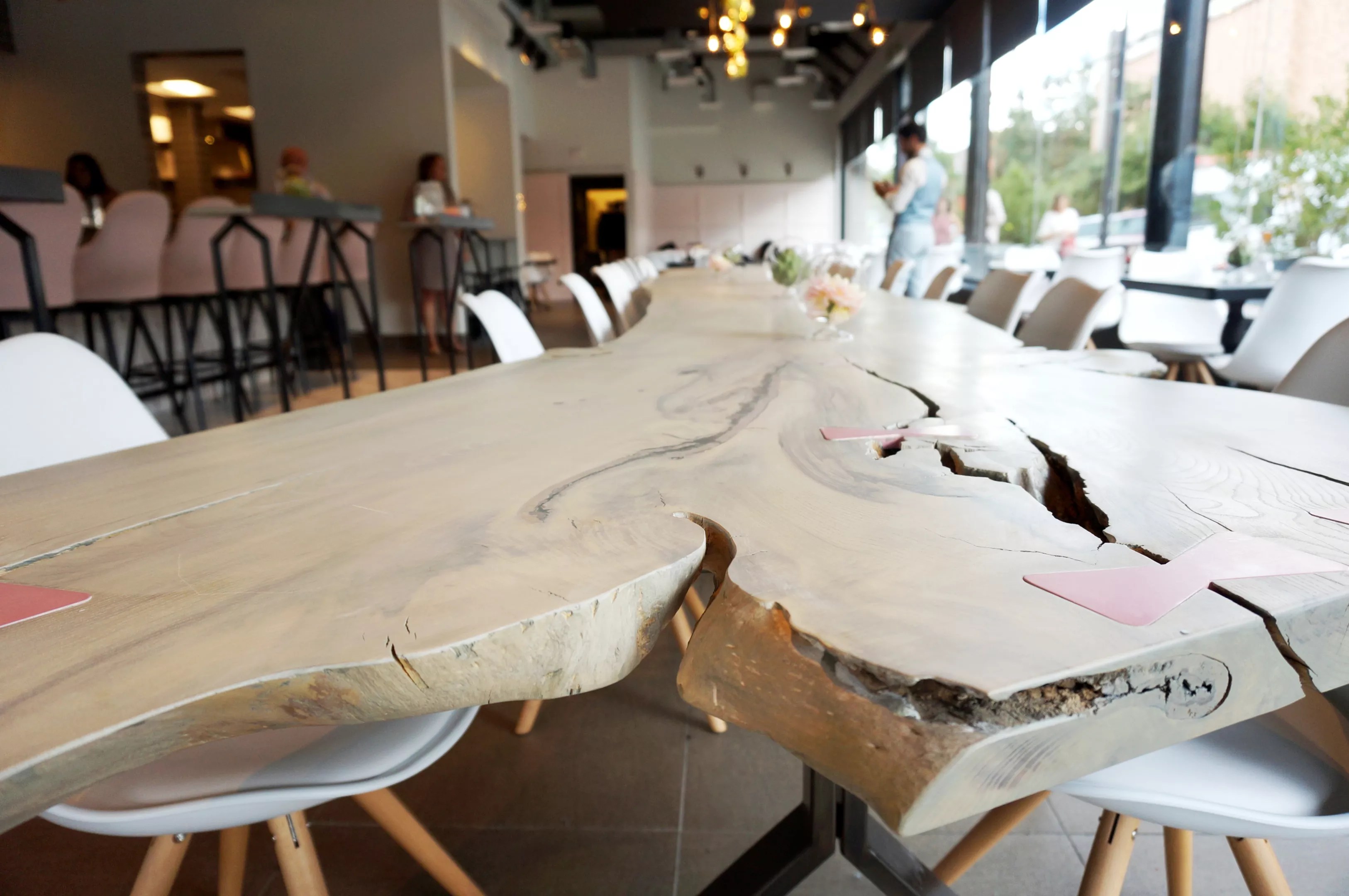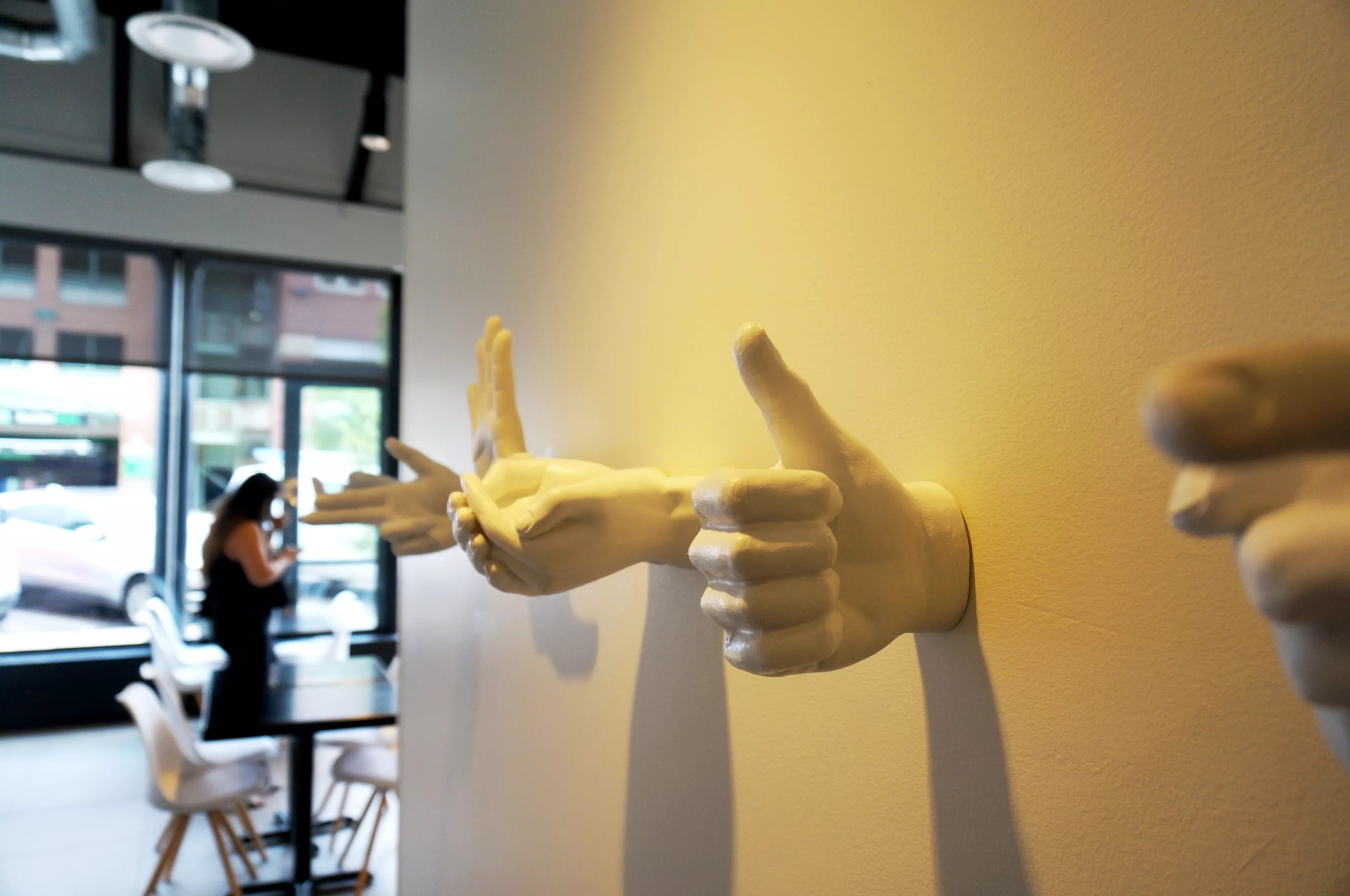 All of Emmerson, which takes its name from a type of wheat, is filled with little surprises. Hints of pink in the interior decor add a soft glow; wallpaper designed by Mike D of the Beastie Boys enlivens a private dining room with Brooklyn references (including iconic images like Nathan’s hot dogs and Notorious B.I.G.); and hand-shaped coat hangers in a back hallway appear to spell out something in sign language. Kaplan worked with Aleks Kaplan (his cousin-in-law) and Amanda Arguello of Shears Adkins Rockmore to bring his vision to reality; other highlights include a lengthy community table built from two slabs of a hackberry tree trunk, a white marble bar top, and a foyer surrounded in antique curios, not the least of which is a taxidermied two-headed duckling.