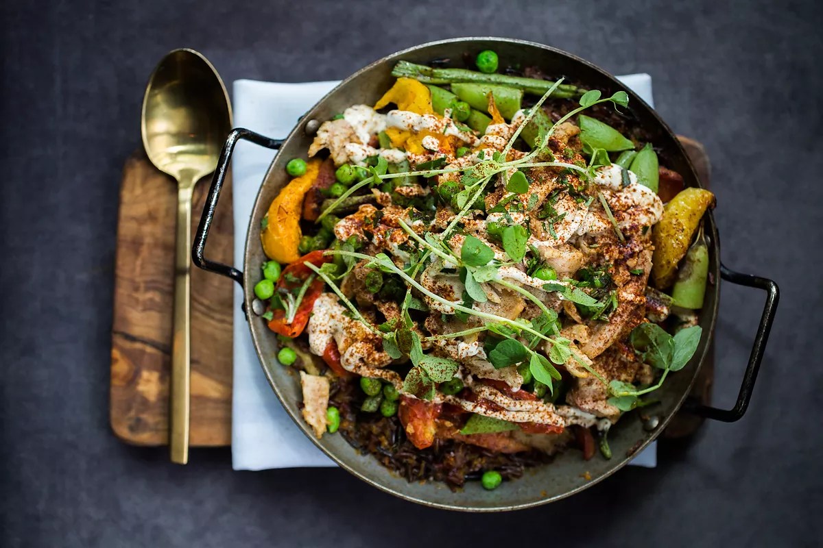 Birdcall, 800 East 26th Avenue El Five‘s Valencian paella: rabbit confit, smoked sausage and wild rice. Danielle Lirette