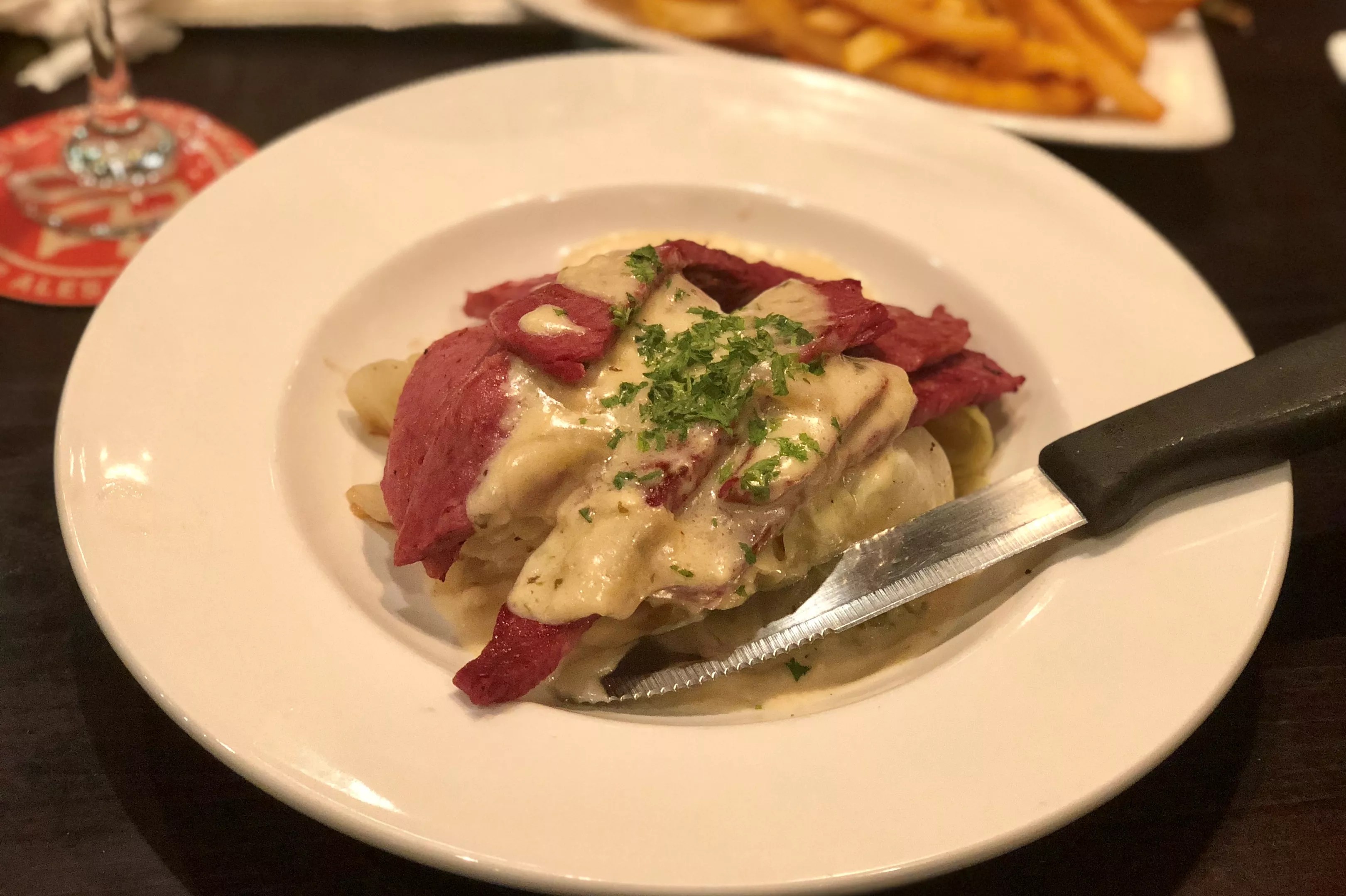 For starters, the place is more of a sports bar that sells Guinness and Irish whiskey than it is an Irish pub, which is fine if you’re not in it for the food, because you’ll appreciate it as a comfortable gathering place. There’s plenty of space to enjoy your drinks at the bar or have a nice chat over a pint of Smithwick’s in a quiet booth with a friend. Unfortunately, on my visit, that’s where the charm ended. Based on the popularity of poutine these days, you may be inclined to try the French-Canadian snack of fries covered in cheese curds and gravy, to which Maggie Smith’s adds brisket. But sadly, the pub was out of the appetizer when I ordered it. I could understand this being the case at 11 p.m. on a busy Saturday night, but I was a bit confused that they were plumb out of brisket at 7:30 p.m. on a Tuesday.