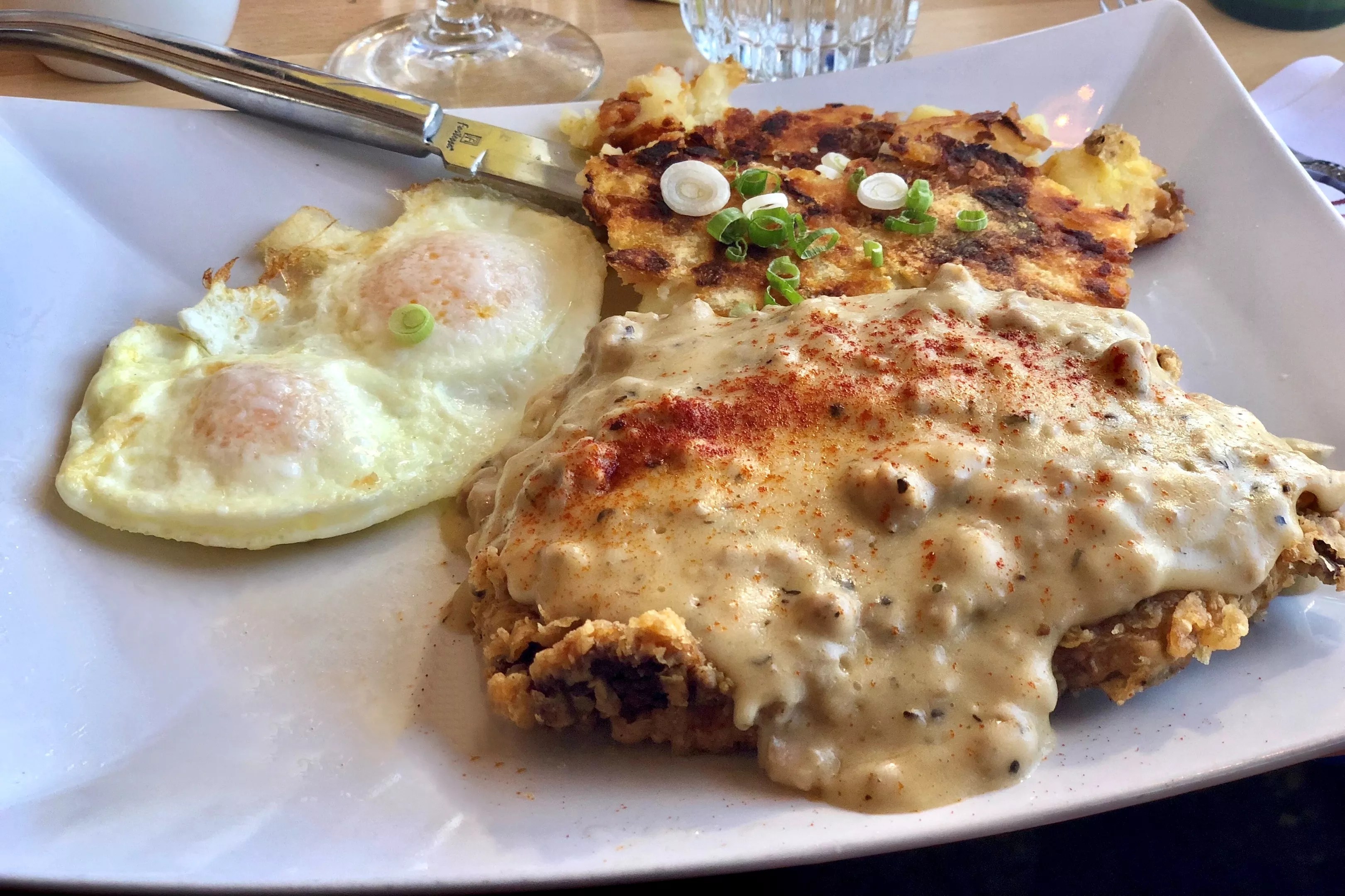 On the other hand, if you’re in the mood to consume a day’s worth of calories for breakfast, the hand-breaded, housemade chicken-fried steak and eggs proves a satisfying option. The peppery cream gravy spilled over the top of the breaded beef on my plate and had a delicious sausage flavor and a touch of spice from a shower of cayenne powder. The side of pan-fried potatoes, pressed into a cake with a crusty, brown exterior, were a little dry, but otherwise were a good change of pace from the hash brown shreds of typical breakfast fare.