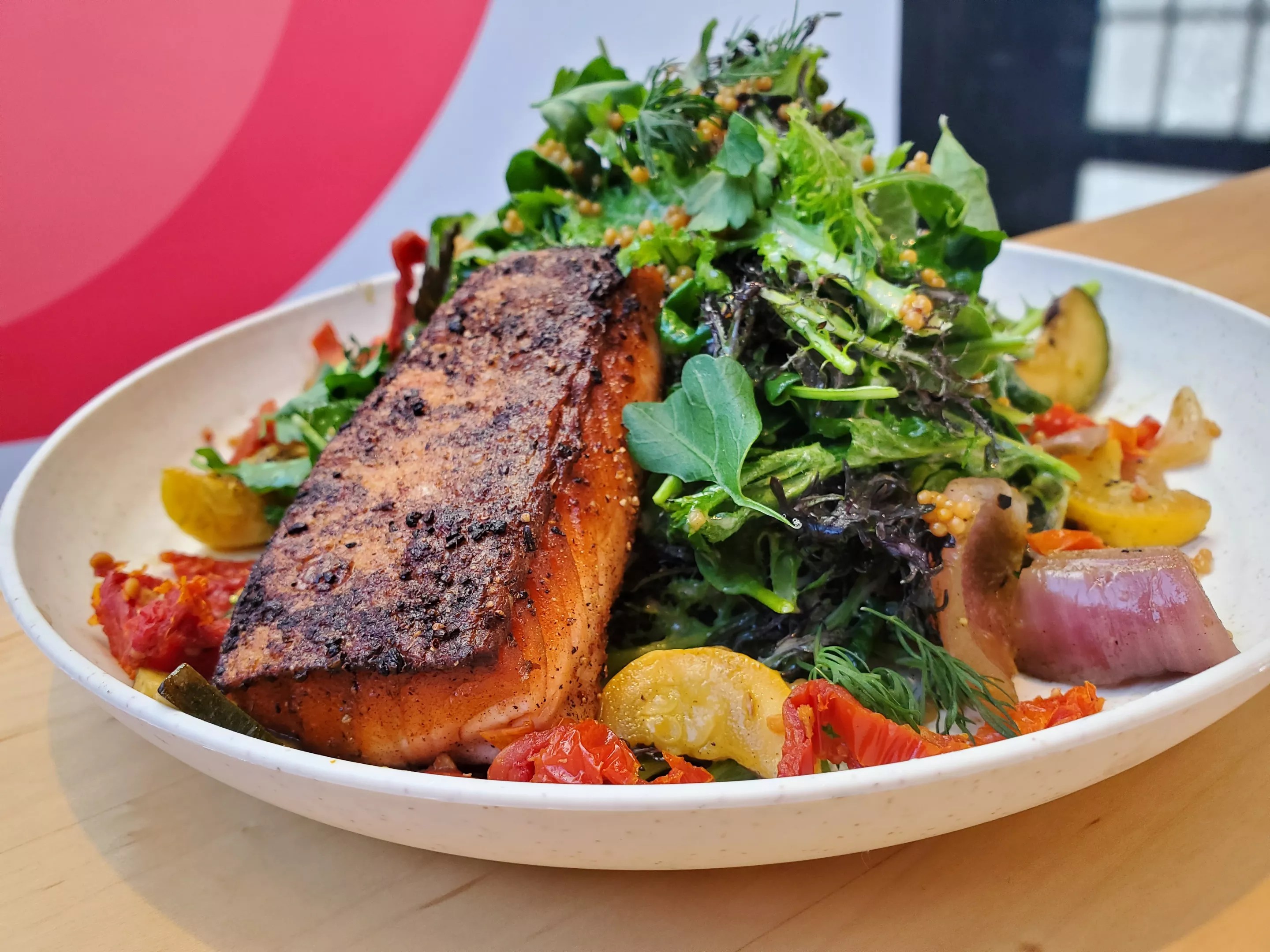 The menu includes soups and salads, with the option to add grains to create a bowl. The Jumper is a combination of spicy micro mix, arugula, parsley, dill, grilled squash, zucchini, red onion, marinated sun-dried tomatoes and pickled mustard seeds with a Dijon vinaigrette. While you can add chicken, tofu or salmon to any salad on the menu, this one includes a tender salmon filet with crisp skin. It’s a filling meal that left me energized instead of in need of a nap, and the fresh, ultra-flavorful greens play a starring role.