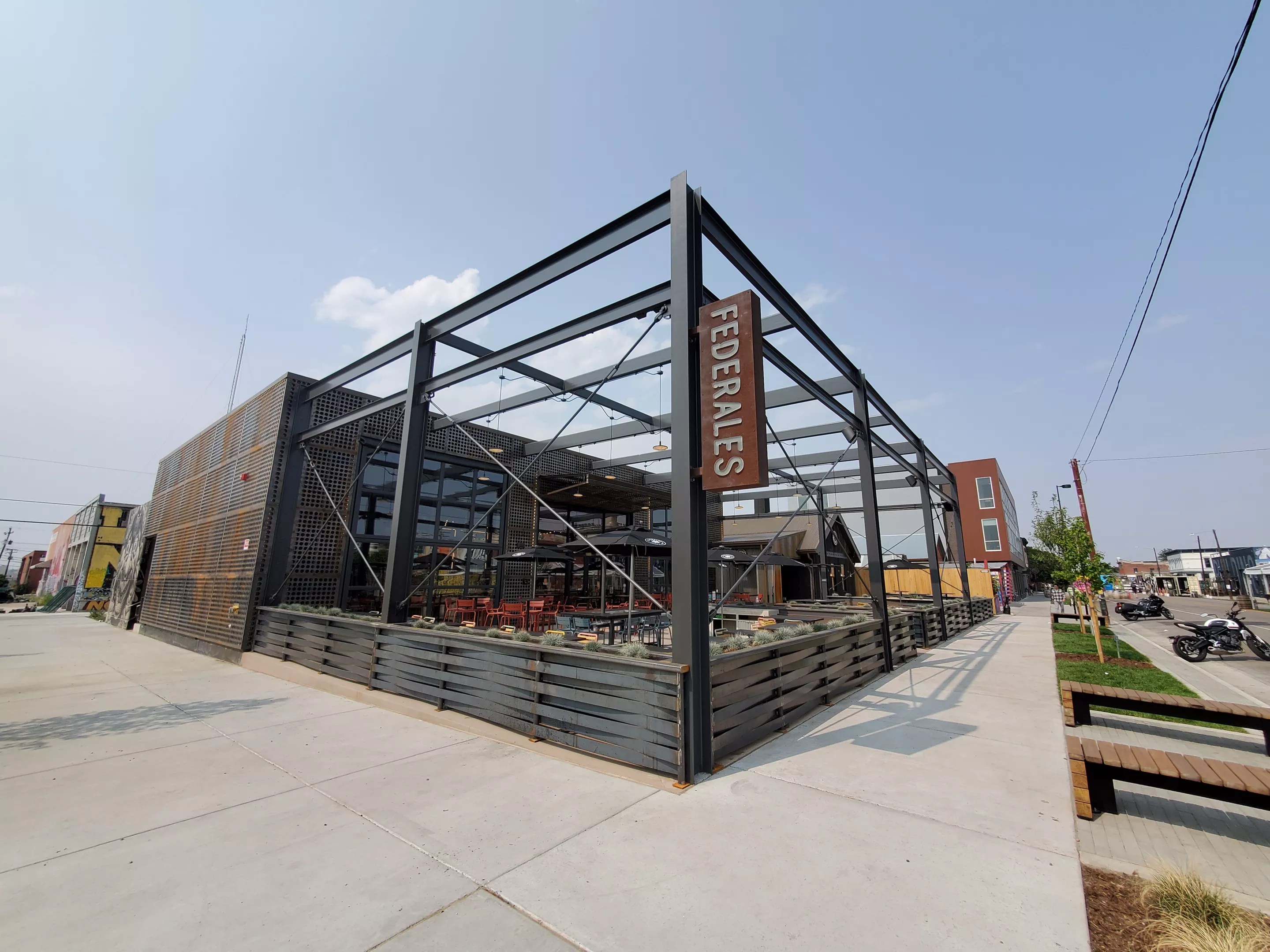 The black-metal structure surrounding an open-air patio is the first thing you see when you walk up to Federales, located next to Finn’s Manor at the corner of Larimer and 29th streets; it’s outfitted with a retractable roof and garage doors. This lot formerly held an auto-repair shop, and the home of the business’s owner is a designated historic building that could not be torn down. Instead, it’s been covered in black siding with a Federales logo at the top, and will be used as a to-go ordering and pick-up hub.